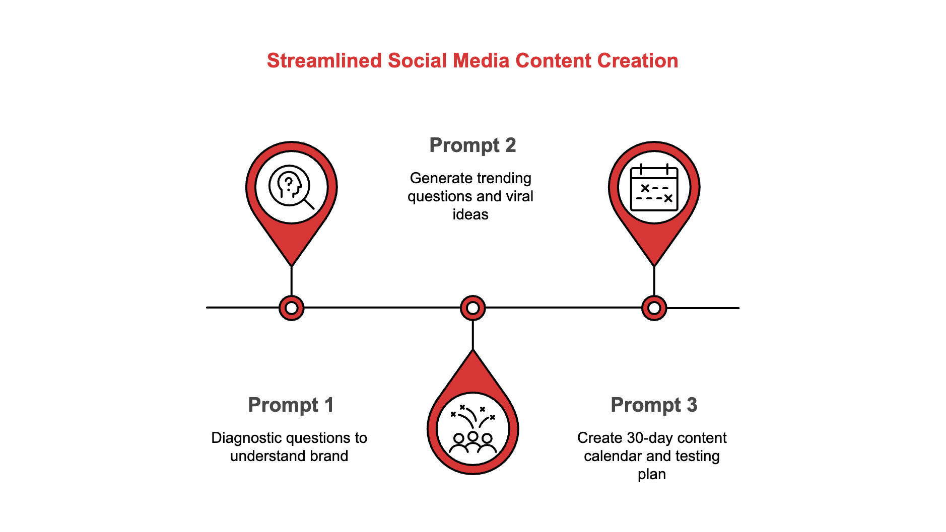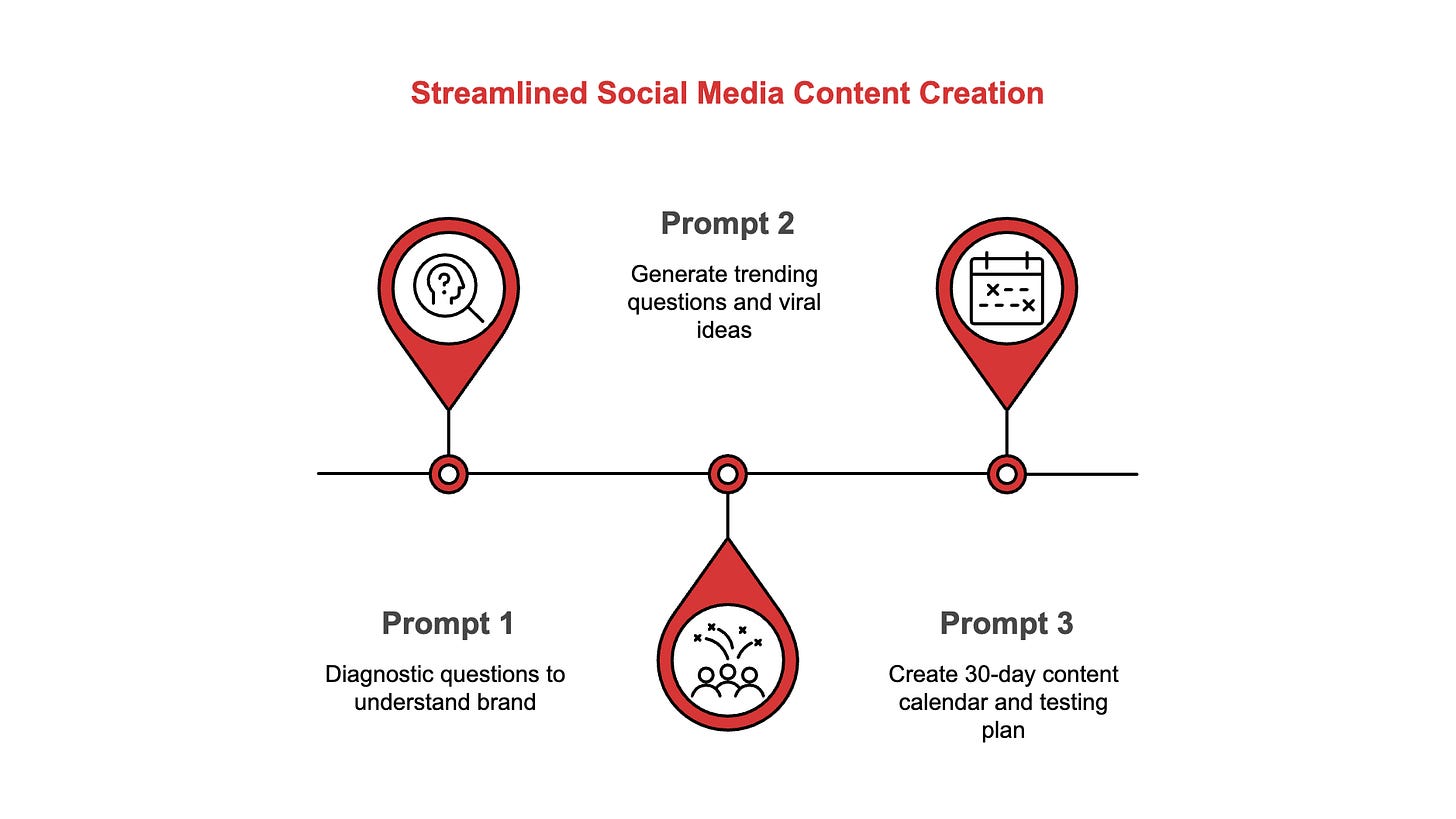Prompt 1 collects your business context and diagnoses where your social media is broken. Prompt 2 finds trending questions your audience is searching for right now and turns them into 20 viral content ideas. Prompt 3 packs those ideas into a 30-day calendar with captions, formats, and a testing plan.