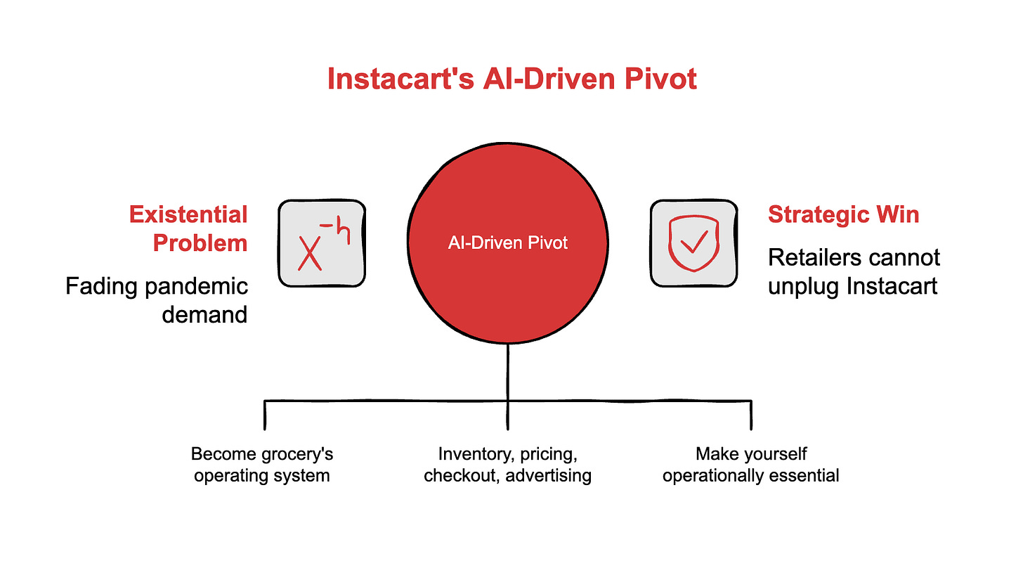 Between 2020 and 2025, Instacart faced an existential problem. Pandemic demand was fading. Retailers were building their own delivery. The low-margin delivery model was a dead end.