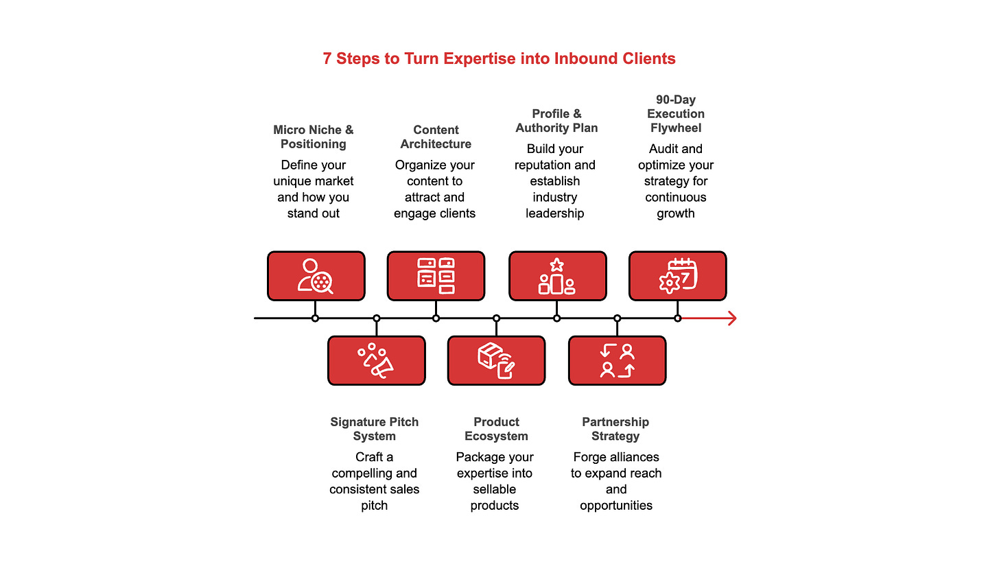 I’ve merged both methods into a single AI-powered workflow. Seven prompts, run in sequence, each one feeding into the next. By the time you finish prompt seven, you’ll have a niche statement, a pitch system, a content plan, a product ecosystem, a profile strategy, a partnership playbook, and a 90-day execution plan.