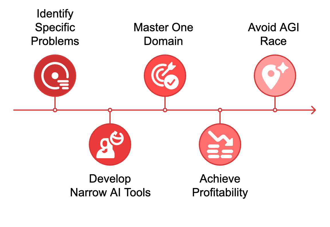 This isn't just safer, it's profitable. While competitors burn resources racing toward AGI, you can dominate specific use cases with focused AI tools.
