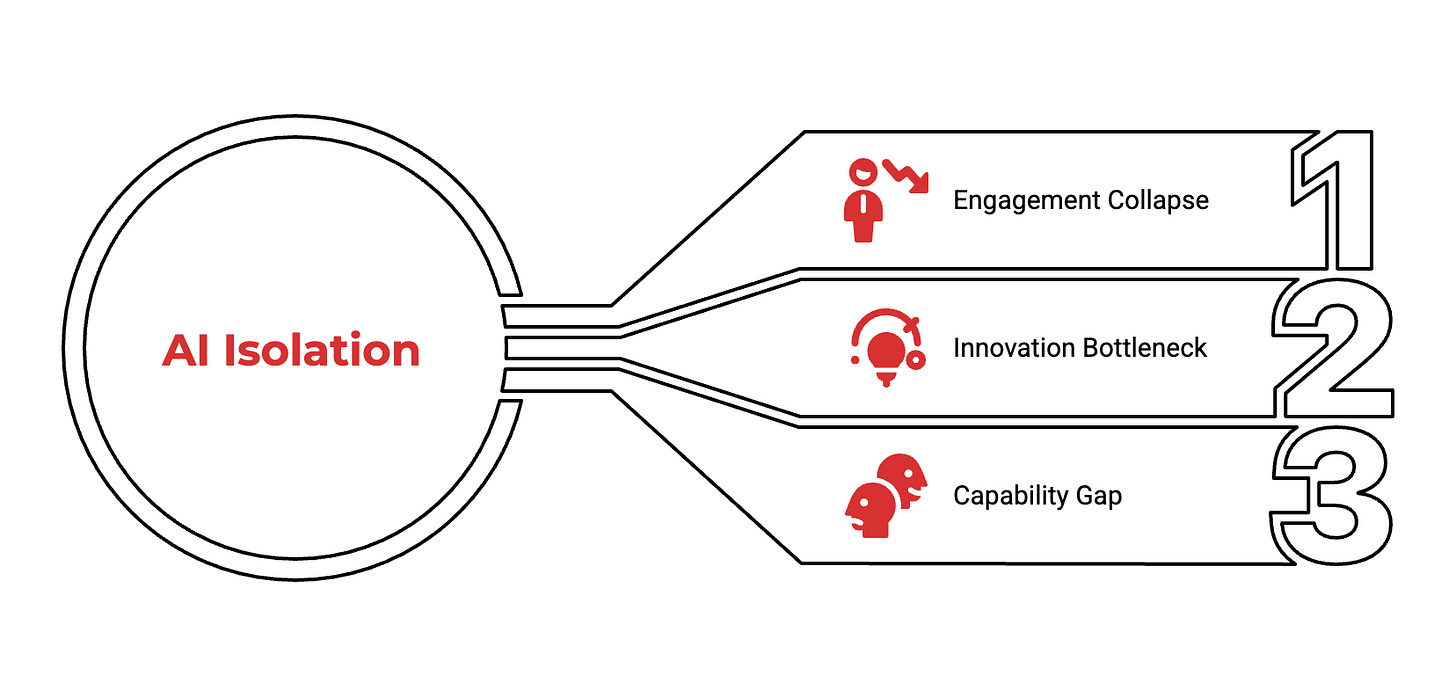 Innovation thrives on cognitive friction. Different perspectives colliding is how breakthroughs happen. When employees default to AI instead of colleagues, your company gets one perspective multiplied. The research specifically notes that AI-driven work creates idea echo chambers, limiting the "creative abrasion" that fuels innovation.