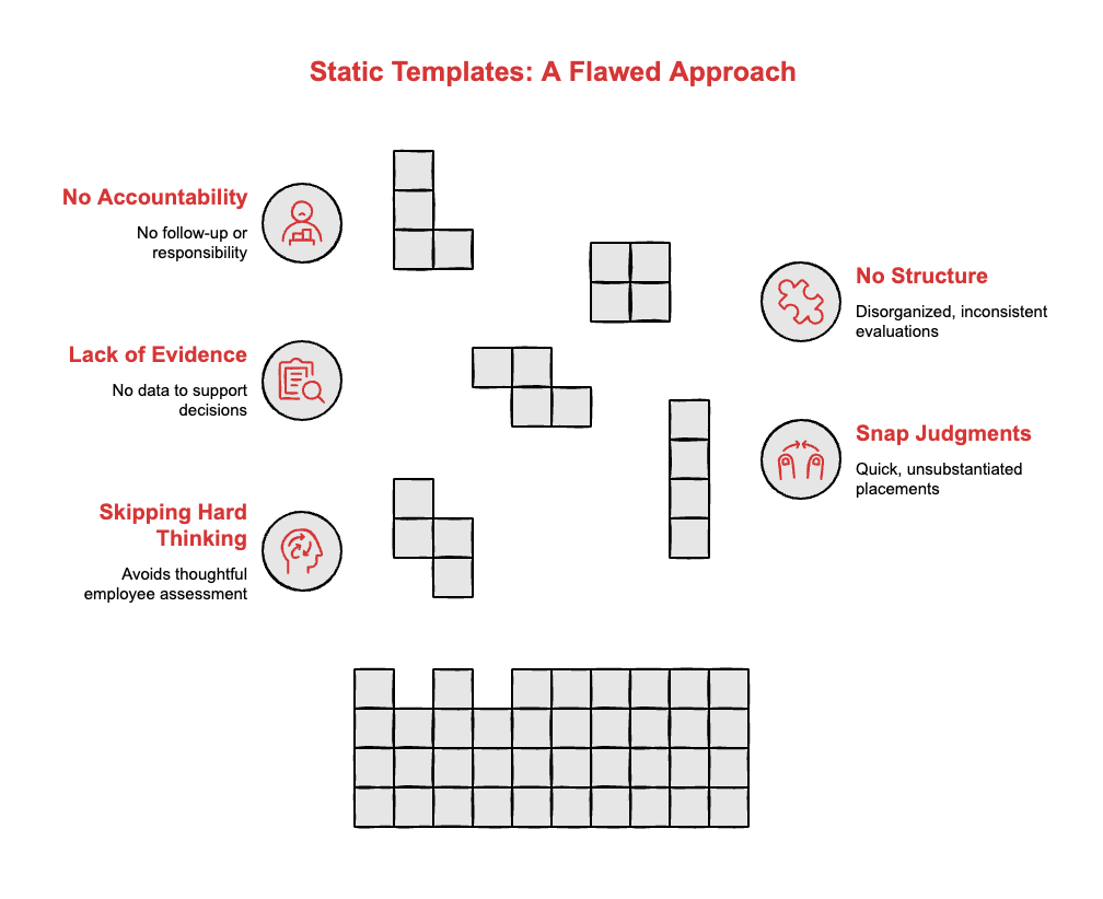 Templates let you skip the hard thinking. You glance at someone’s name, make a snap judgment, drop them in a box. No evidence. No structure. No accountability.