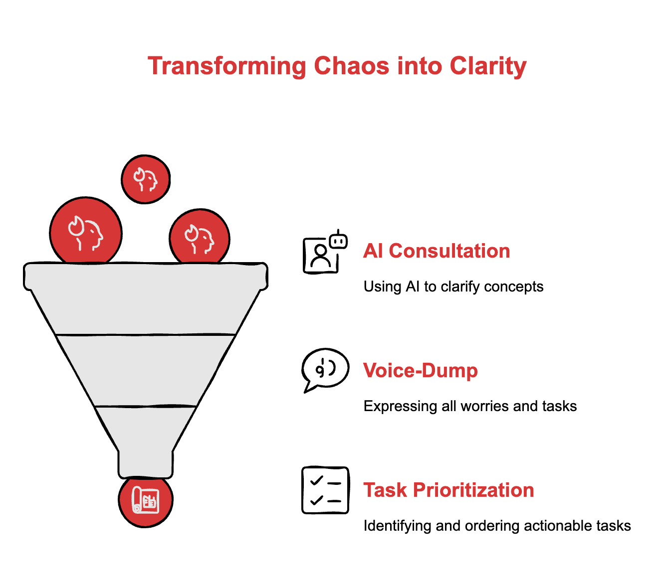 Action: Voice-dump everything. Every worry, deadline, political nightmare, impossible request. Three minutes of pure chaos.