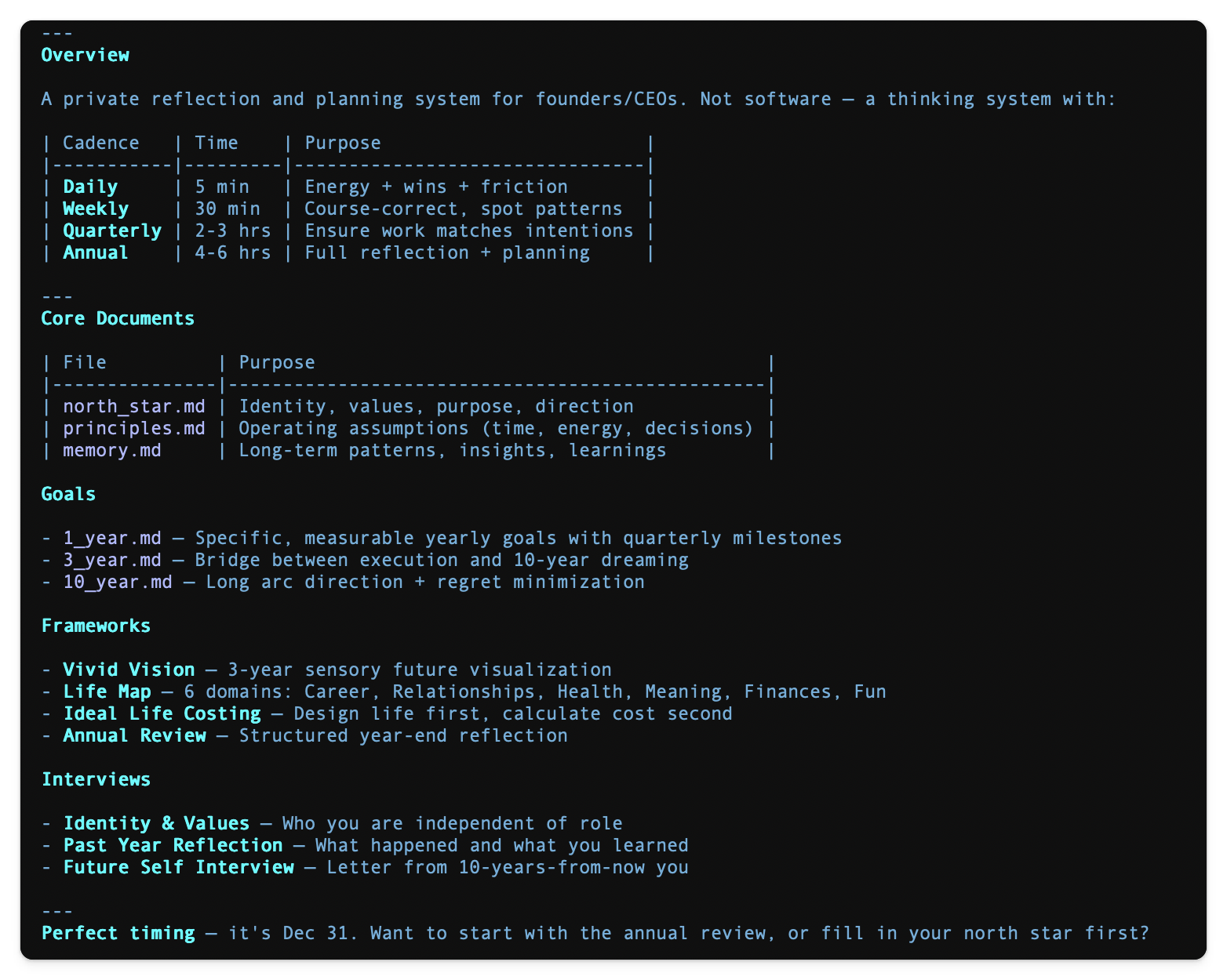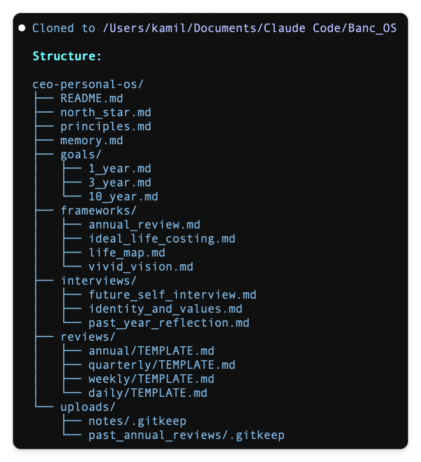 Claude Code will build a complete folder structure on your computer. The system includes daily check-ins, weekly reviews, quarterly alignment checks, and annual reflection templates.