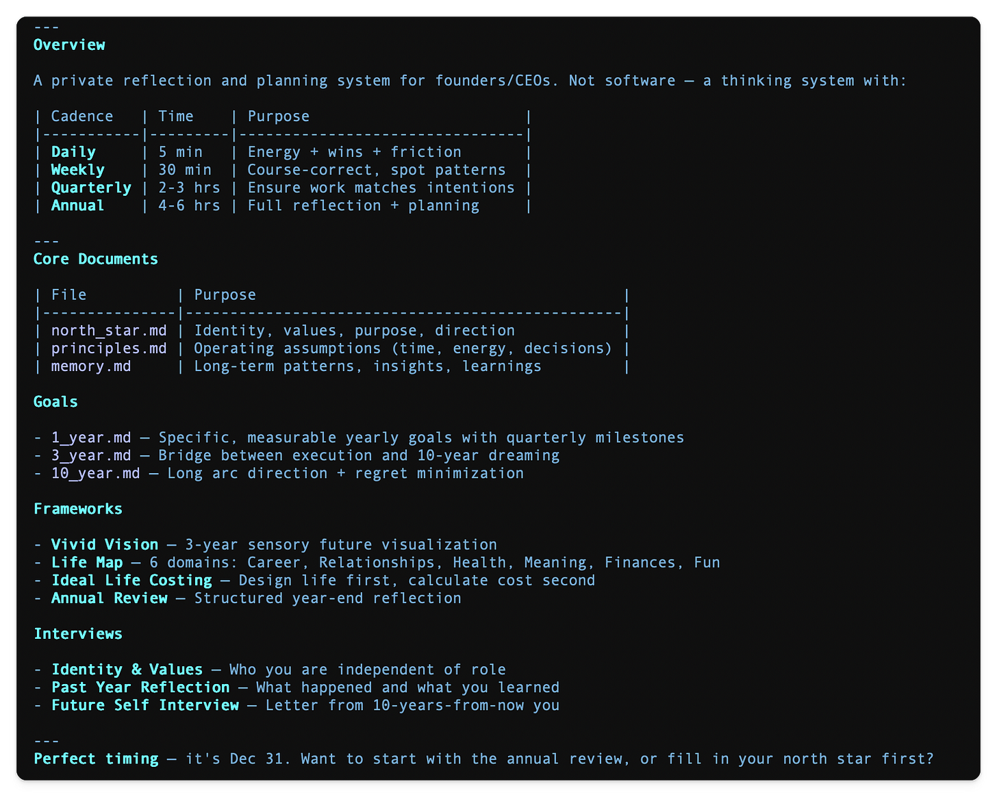 By the end of this newsletter, you’ll have a complete personal operating system on your computer. Twenty files. Daily check-ins, weekly reviews, quarterly alignment, annual reflection. Built in under ten minutes. No coding required.