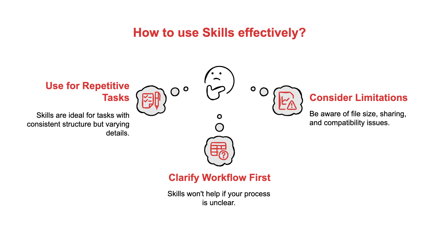 If you’re still figuring out your process, Skills won’t help yet. Get your workflow clear first. Write it down as a checklist or template. Then turn that into a Skill.