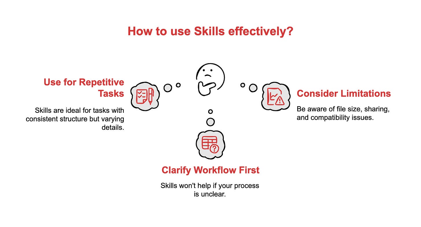 Skills work best for tasks you do repeatedly with small variations. Monthly reports where the structure stays the same but the data changes. Client emails that follow a template but need different details. Meeting summaries that use your company’s format.