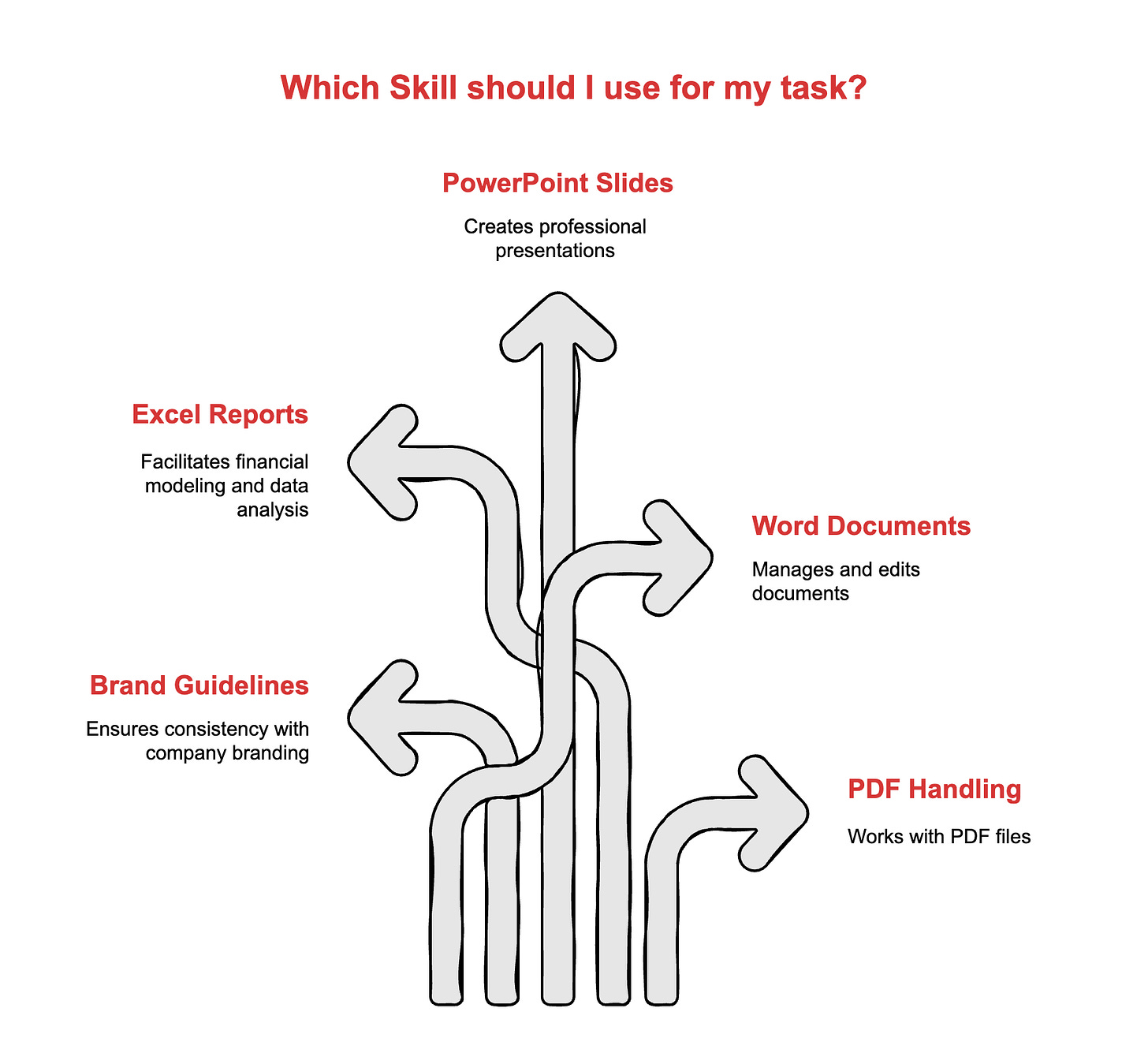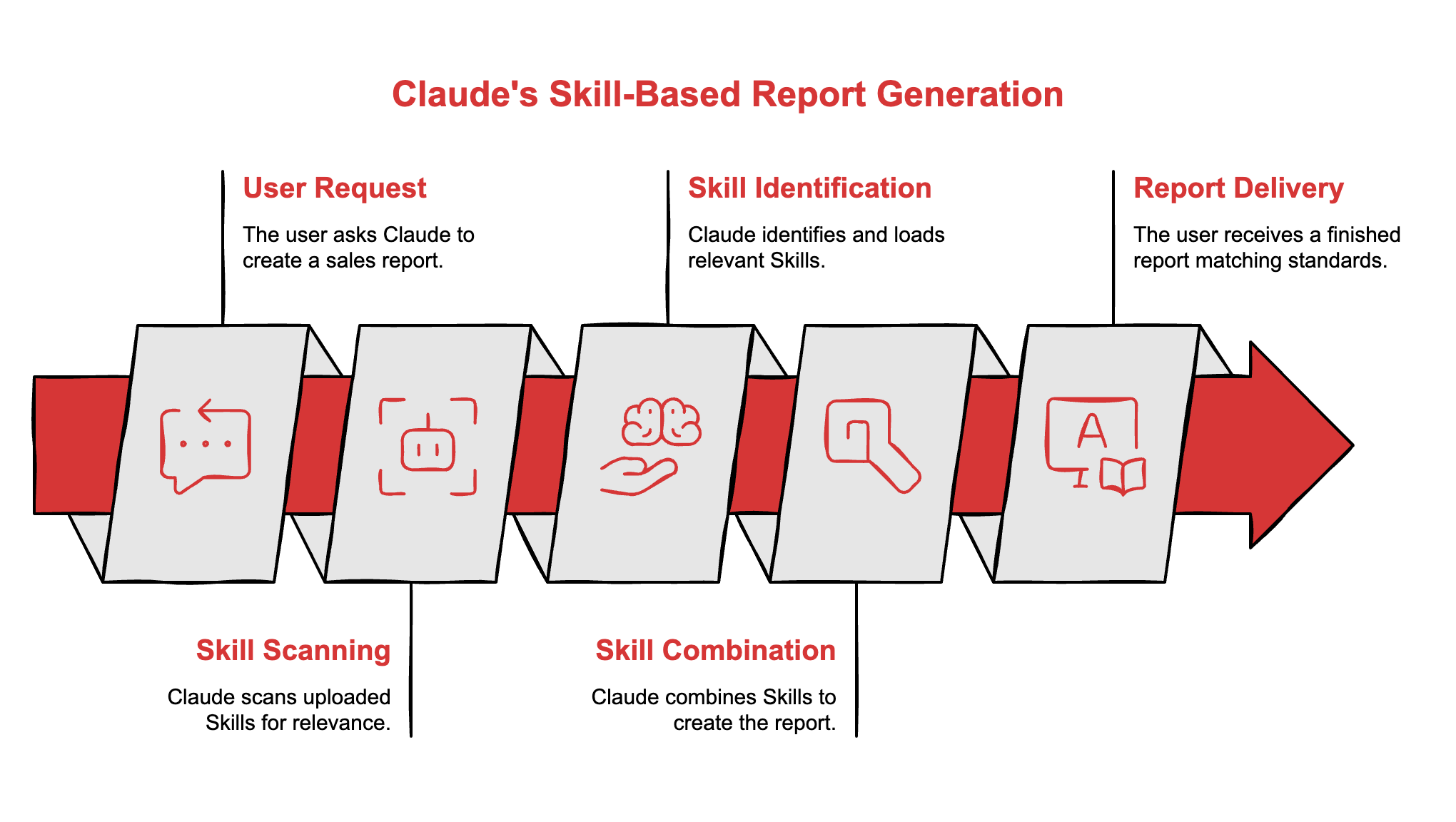 No copying templates. No pasting brand guidelines. No, reminding Claude how you want things formatted. Skills load, combine, execute.