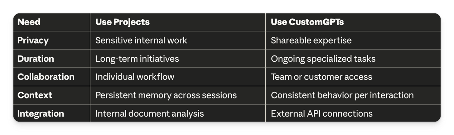 Think of Projects as your personal research assistant that remembers everything about your current initiative. CustomGPTs are more like hiring experts you can clone and share across your team.