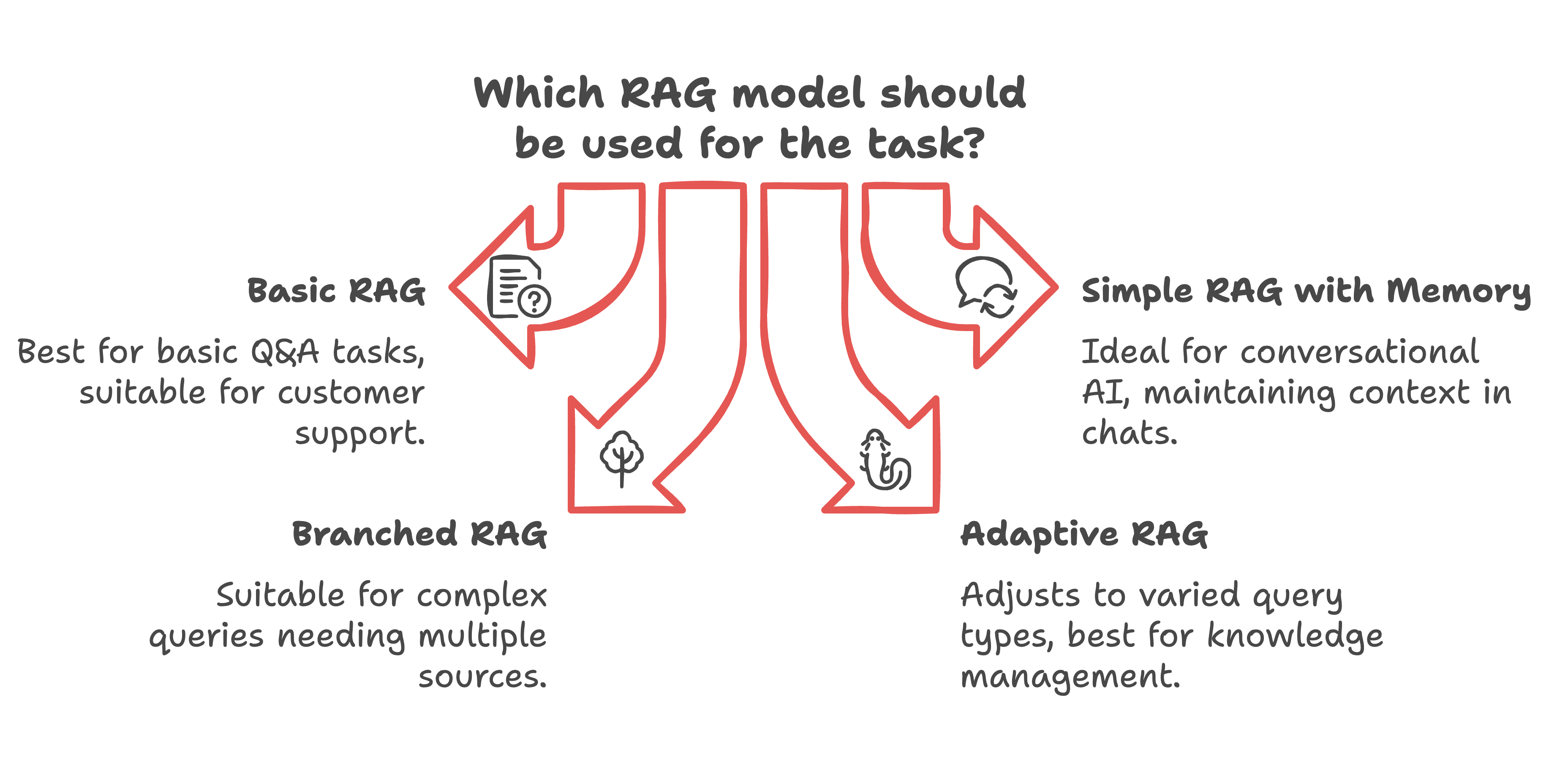 Each of these cases shows how different types of RAG can be matched to specific business needs. Thrive Market's complex recommendation engine required Adaptive RAG's sophisticated capabilities, while ManyChat achieved significant results with a simpler implementation. BloomThat's middle-ground approach with RAG with Memory proved perfect for their customer-centric business model. These examples demonstrate that success with RAG isn't about choosing the most advanced version, but rather selecting the type that best fits your specific business challenges and technical capabilities.