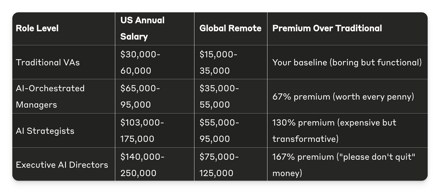 The pay gap tells the story. Traditional VAs earn around $30,000-60,000 annually, like a decent office manager. AI-augmented professionals command $65,000-95,000—think senior analyst money. Specialists? They're pulling down $140,000+, which is "we need this person desperately" territory.
