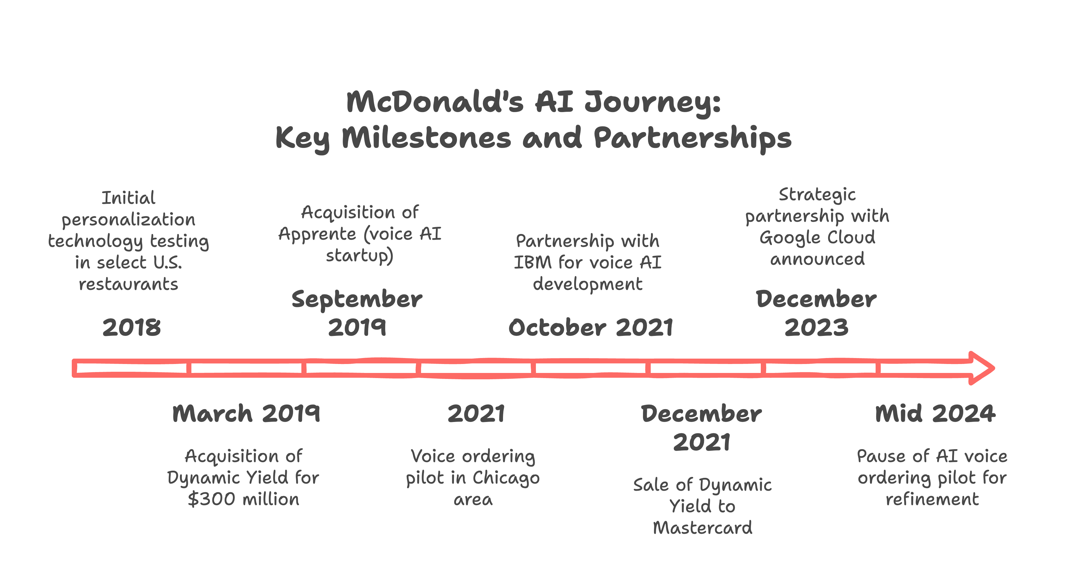 This case study examines McDonald's ambitious journey to implement artificial intelligence (AI) across its U.S. operations from 2018 to 2024. The analysis covers the company's strategic initiatives, challenges faced, and lessons learned in deploying AI solutions across drive-thrus, personalization, operations, and customer experience.