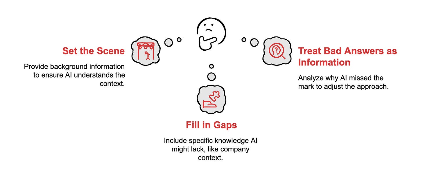 Context. What am I holding that the AI doesn’t have? Your role. The situation. What you’ve already tried. Who the output is for.