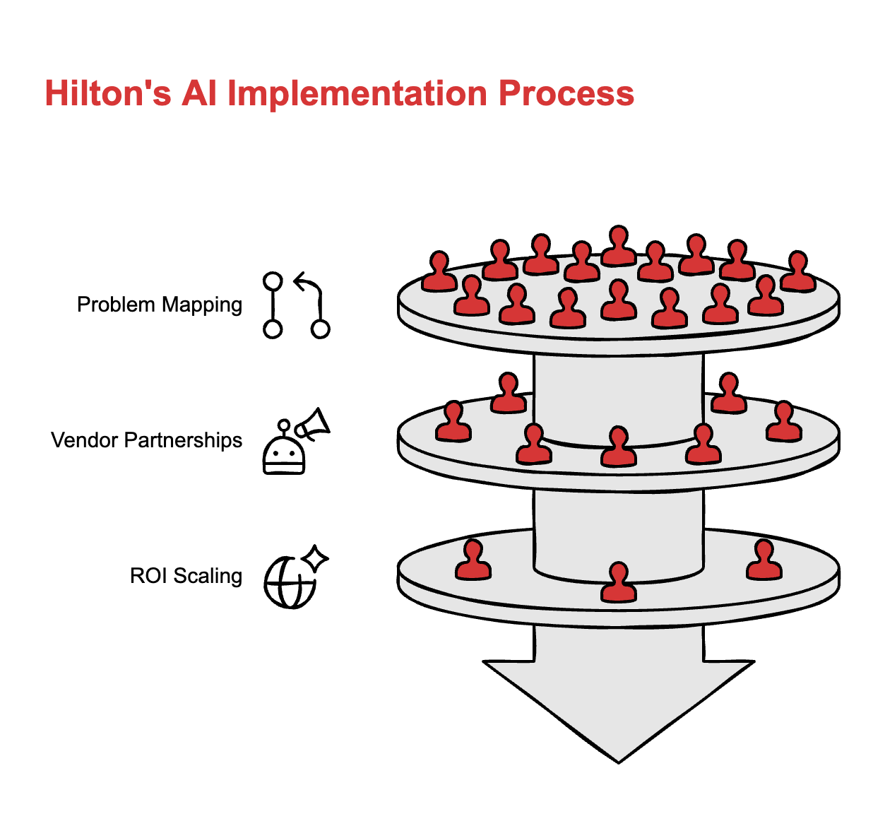 Hilton’s approach split into four phases: cloud migration to break data silos, problem mapping across operations, selective vendor partnerships, and scaling only what showed ROI. The franchised structure forced discipline. Franchisees pay fees based on occupancy and revenue, so underperforming tools would not survive.