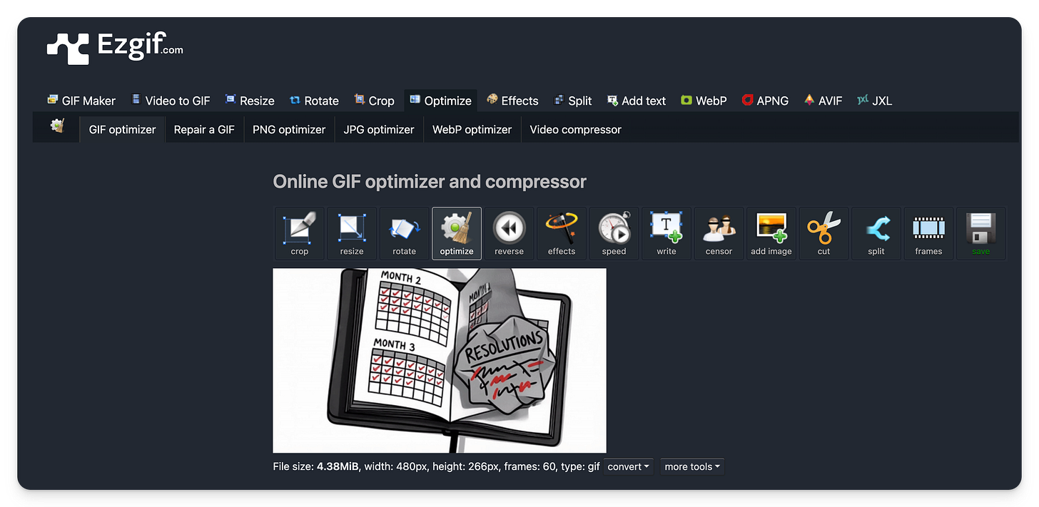Then I run the video through EasyGIF to convert it to a compressed GIF. Scale it down, keep it under one megabyte, save.