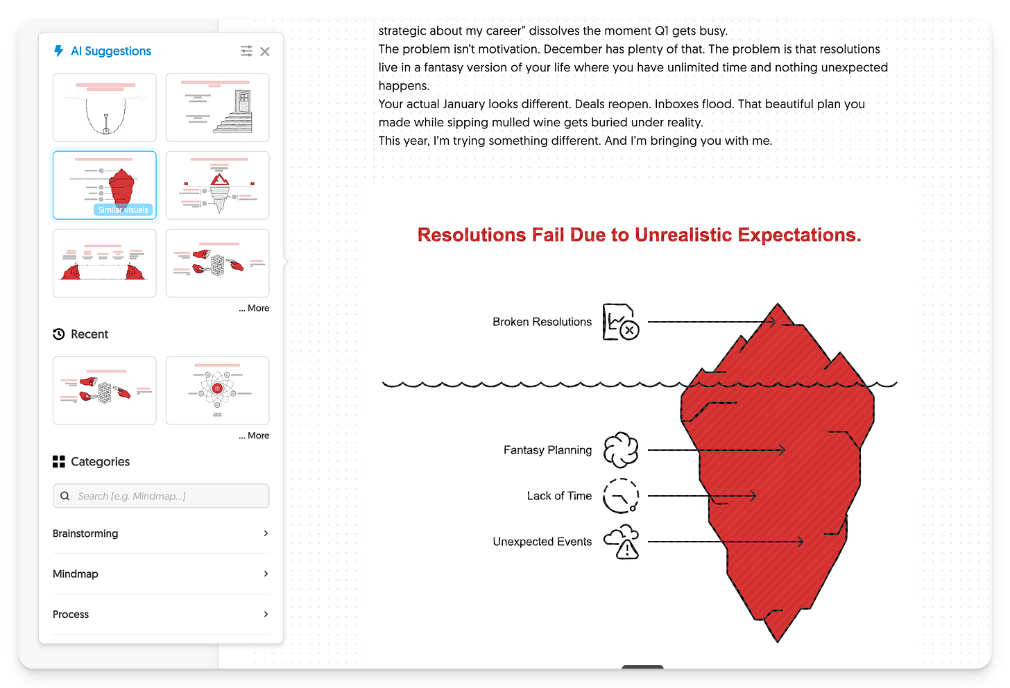 Writing about hidden factors behind a problem? It might suggest an iceberg diagram. Comparing options? A side-by-side chart. Showing a process? A flowchart.