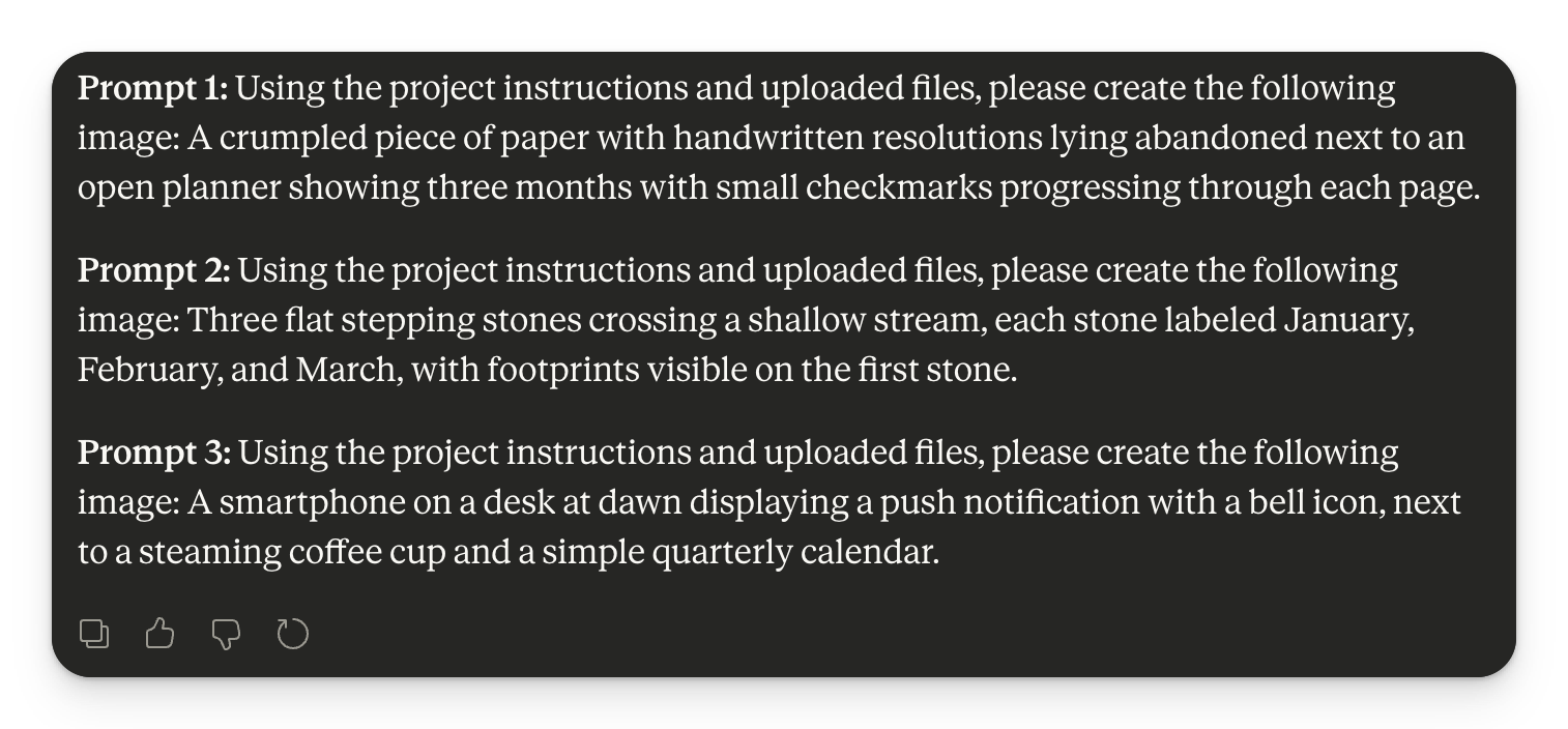 Prefix to each of the 3 prompts: “Using the project instructions and uploaded files, please create the following image:”Simple. Specific. It forces Claude to distill the article down to its visual essence rather than throwing everything at the wall.