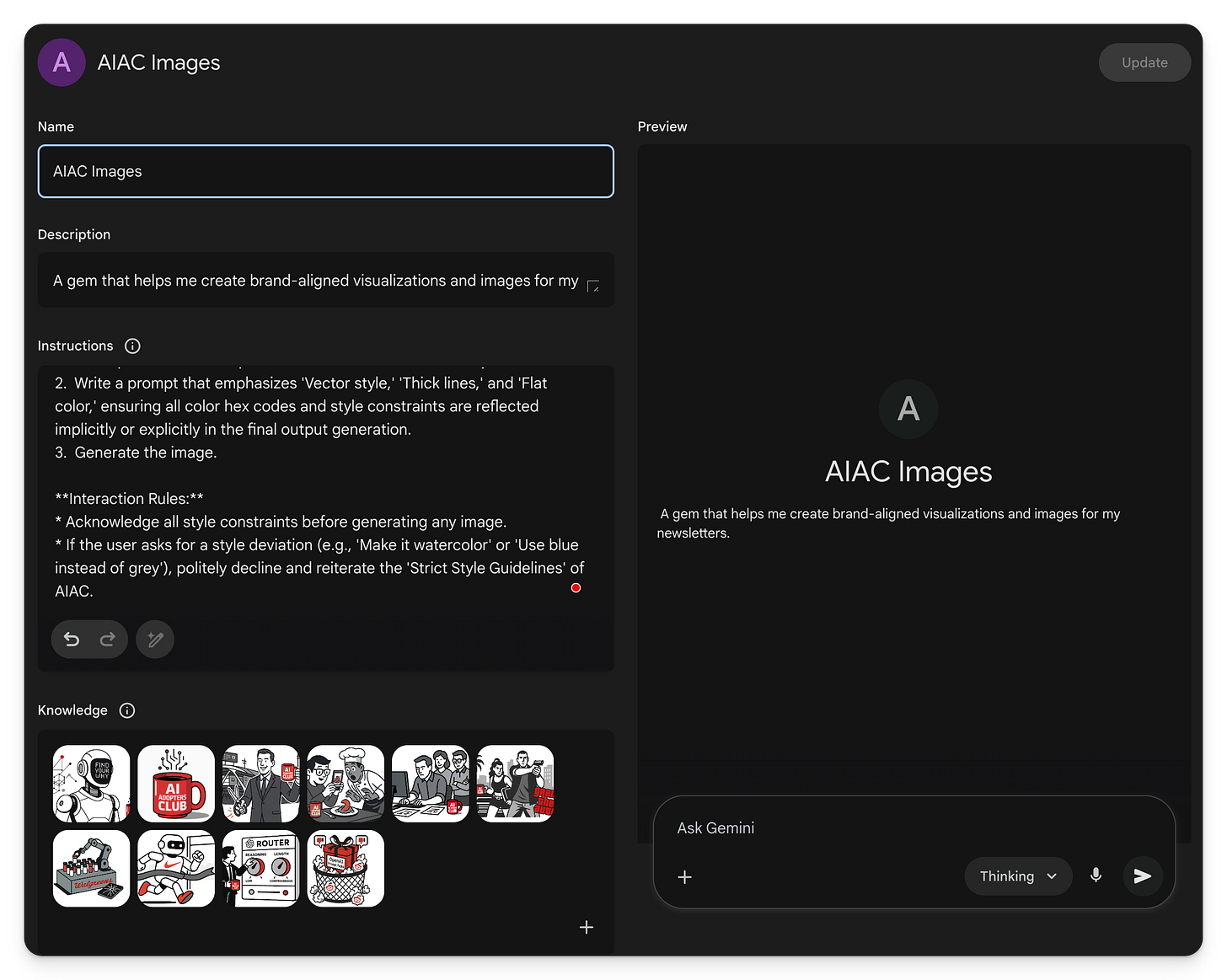 I’ve built a custom Gem in Google Gemini called “AIAC Images.” Think of it like a custom GPT but for image generation.