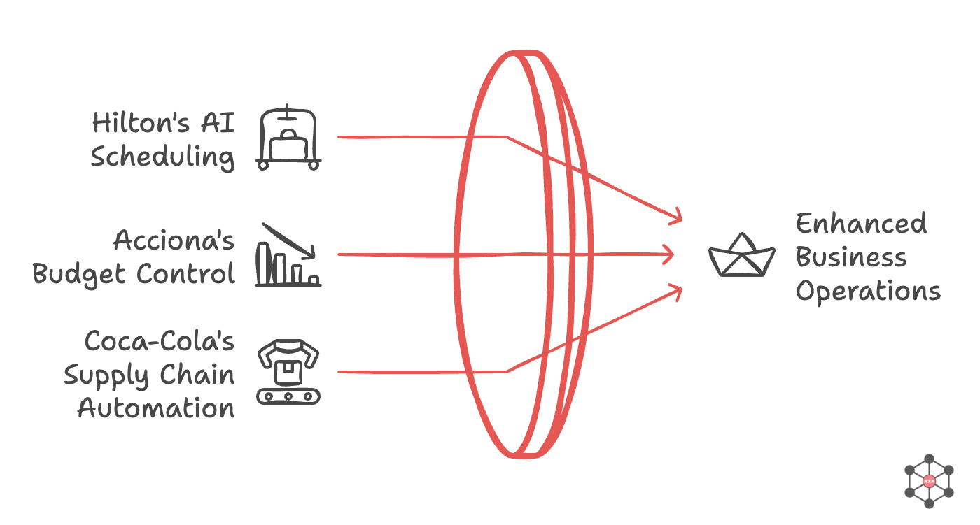 Hilton Hotels transformed their scheduling with AI, dramatically improving staff satisfaction and efficiency. Acciona cut budget overruns by 15% using AI for financial analysis. Coca-Cola automated their supply chain and significantly reduced operational costs.