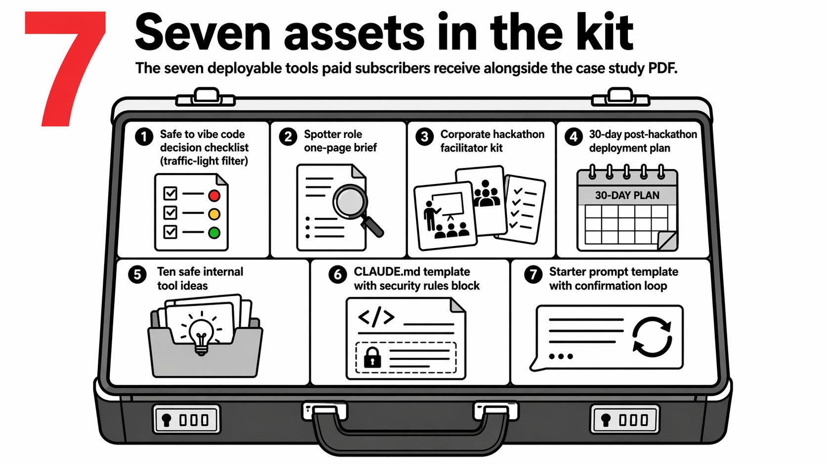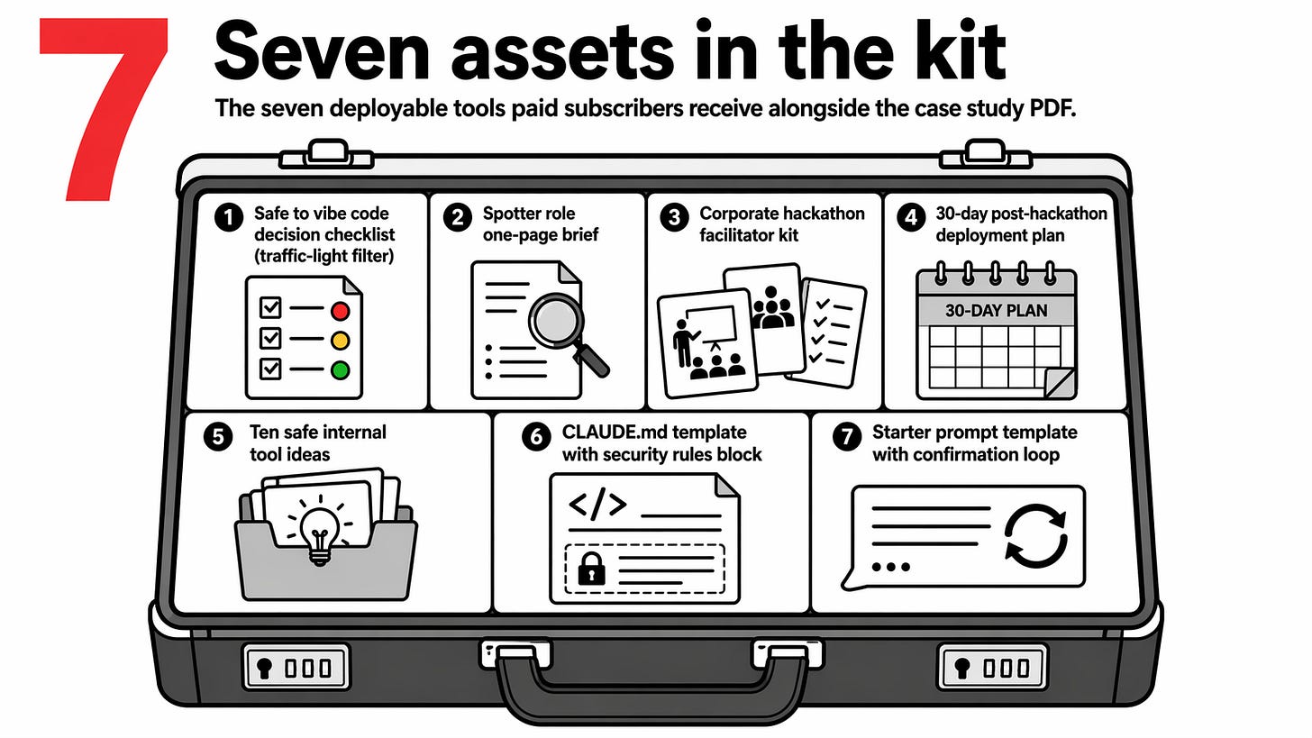Paid subscribers get seven assets built to deploy without adaptation. A traffic-light decision checklist that filters any new vibe coding project before you write the first prompt. A one-page brief on the spotter role you hand to the reviewing developer. A facilitator’s kit for running a corporate hackathon where nobody has vibe coded before. A 30-day post-hackathon deployment plan. Ten bounded internal tool ideas your team can build safely. A CLAUDE.md template with the security rules block that cuts the most common failure modes. A starter prompt template with the confirmation loop that catches misfires before code is written.