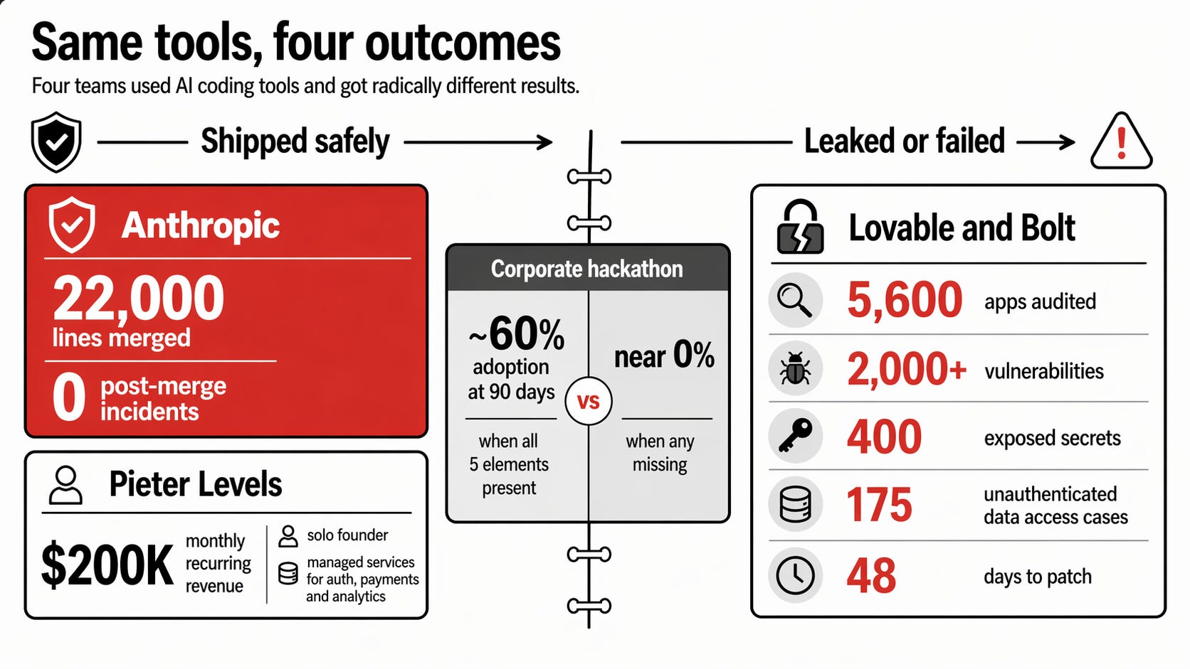 Pattern two. Scope selection is the skill, not prompting. Every case that shipped safely started with a narrow problem where the worst-case failure was a wasted afternoon. The teams that collapsed were building user-facing production apps on day one. Pick small. Stay small. Graduate slowly.