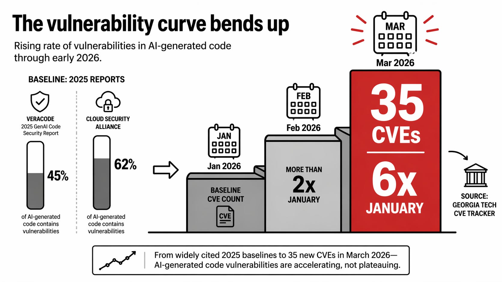 The Cloud Security Alliance puts the figure higher at 62 percent. Georgia Tech’s CVE (Common Vulnerabilities and Exposures) tracker logged 35 new CVEs in March 2026 traced directly to AI-generated code. More than double February’s count. Six times January’s. The trend line is not flattening.