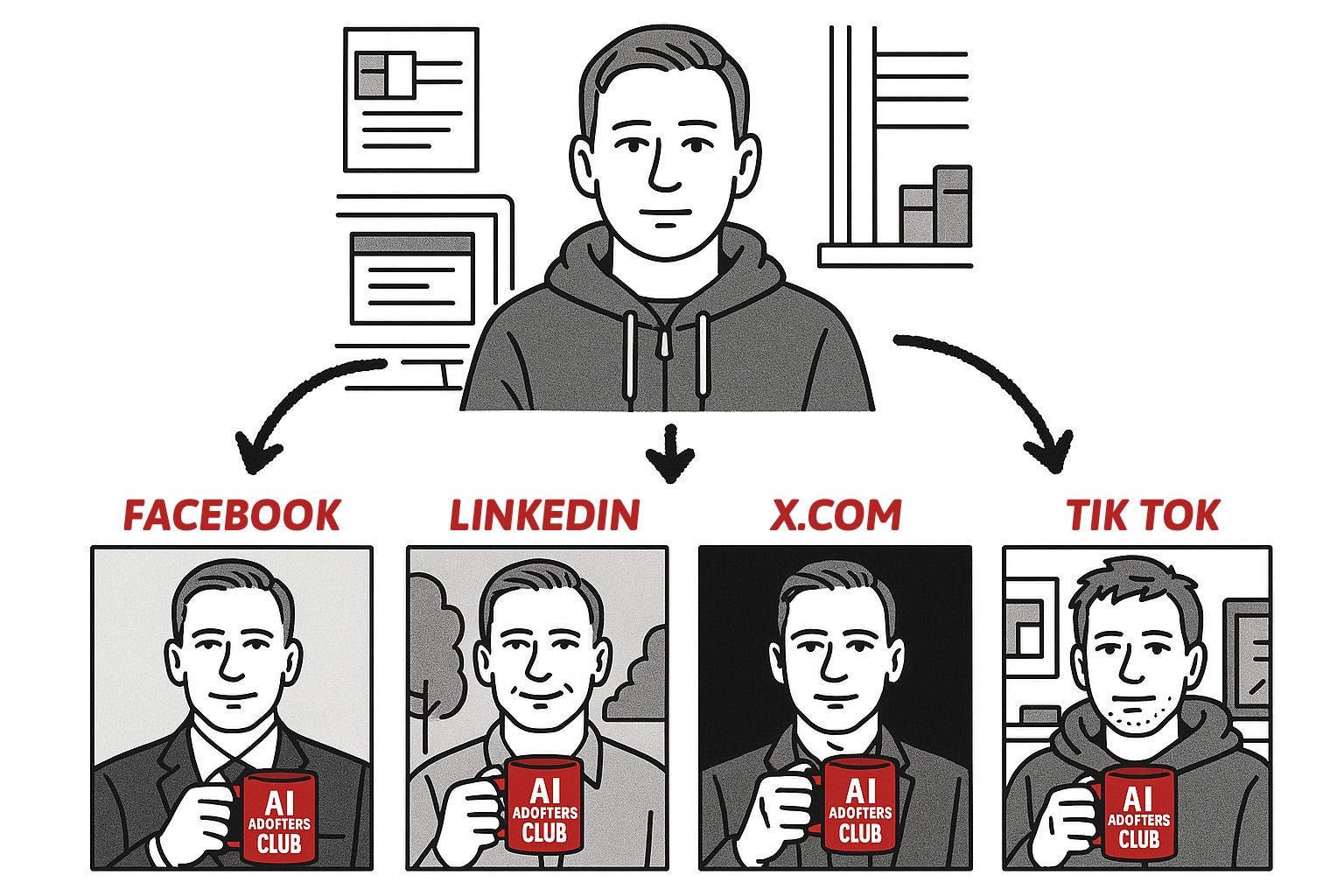 Most professionals juggle multiple profiles. LinkedIn demands corporate polish. Facebook wants approachable warmth. X.com rewards edgy intelligence. TikTok craves creative energy.