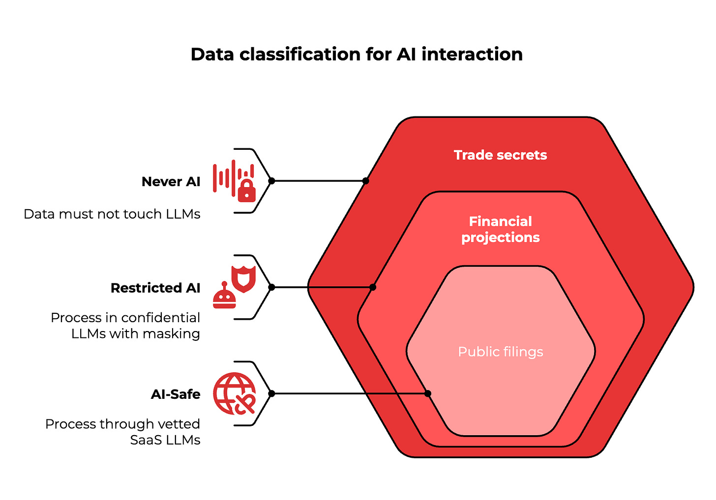 Never AI: Trade secrets, unredacted personally identifiable information, legal strategies, confidential customer data. This data must not touch any external or internal LLM. Store it in encrypted systems and limit access strictly.