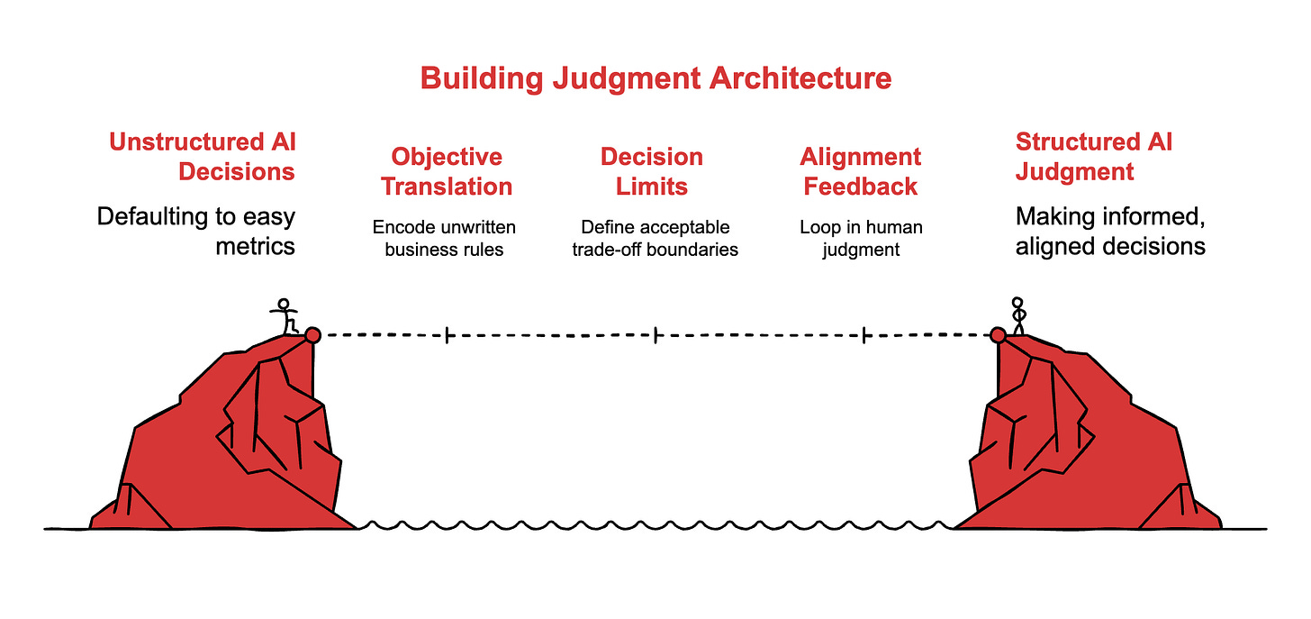 That’s the concept I want to name: judgment architecture. The discipline of extracting your team’s unwritten business rules, the tacit knowledge that employees absorb through experience, and encoding it into machine-actionable parameters.