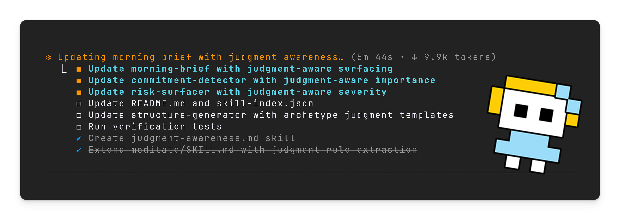 After the email incident, I ran what I call a meditation session. I asked Claudia to /meditate, a command that triggers a review of our recent interactions. She analyses decisions I made, patterns in how I override her suggestions, and inferences about what I prioritize.