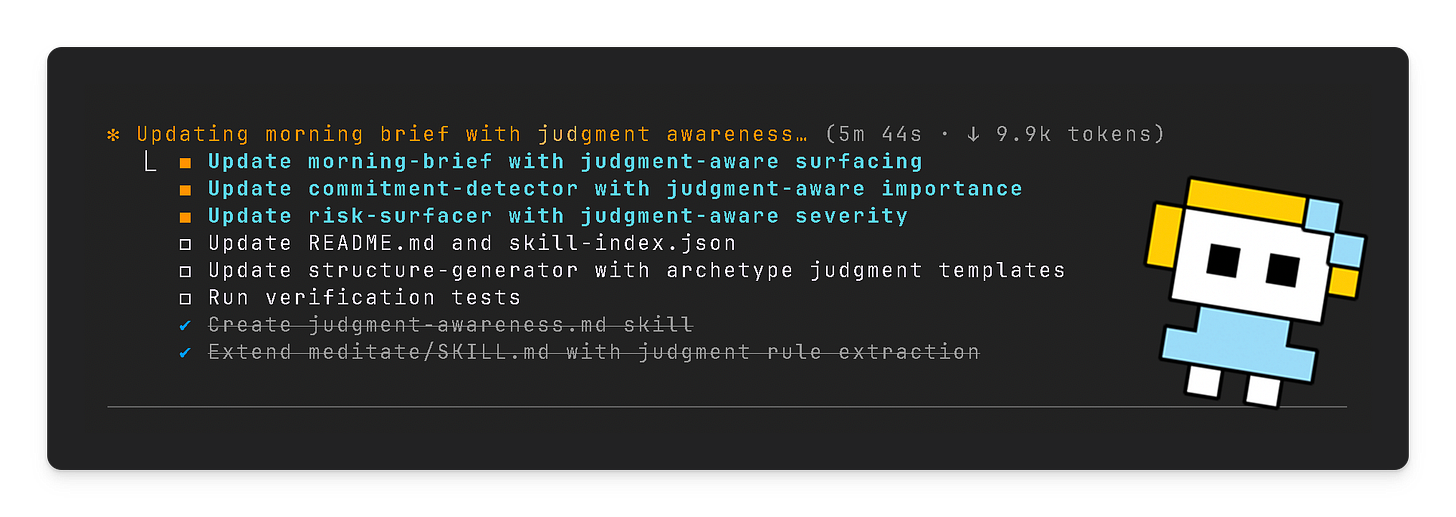 The rules accumulate. Each meditation session makes the judgment layer more accurate, more aligned with how I operate. She proposed another after noticing I rescheduled three internal meetings to accommodate a client deadline: “Should I default to prioritizing client-facing commitments over internal blocks?”
