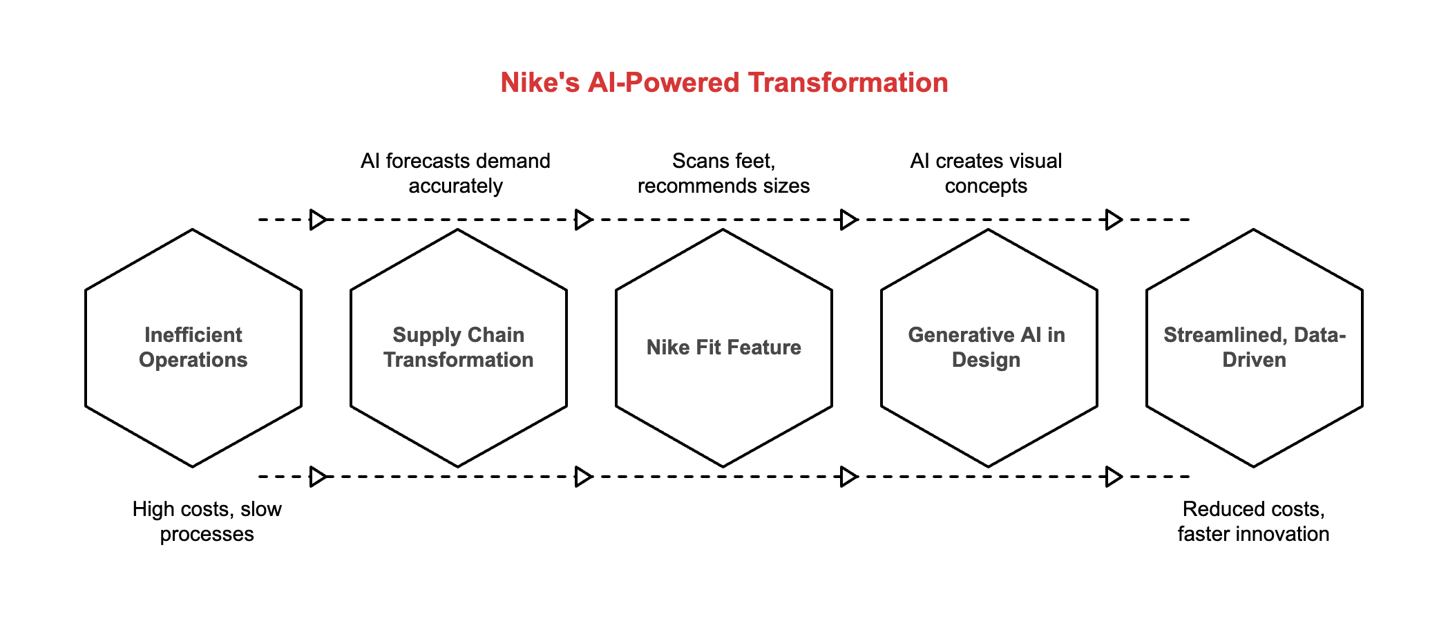 Between 2019 and 2024, Nike’s direct sales jumped from $11.8 billion to roughly $23 billion. AI powered the entire shift. The company bought four startups, integrated them fast, and went to market.