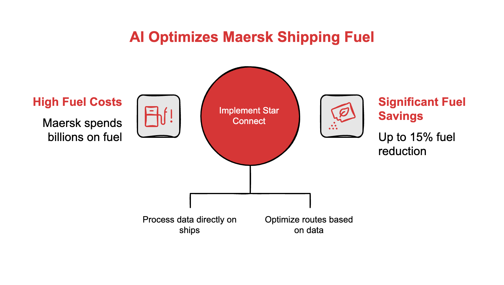 The payoff: up to 15% fuel savings on optimised routes. Maersk spends between $5 billion and $7 billion a year on bunker fuel. Even applied to half the fleet, that saving sits somewhere between $375 million and $500 million annually. One AI use case, likely paying for the company’s entire 2,900-person tech centre in Bengaluru multiple times over.