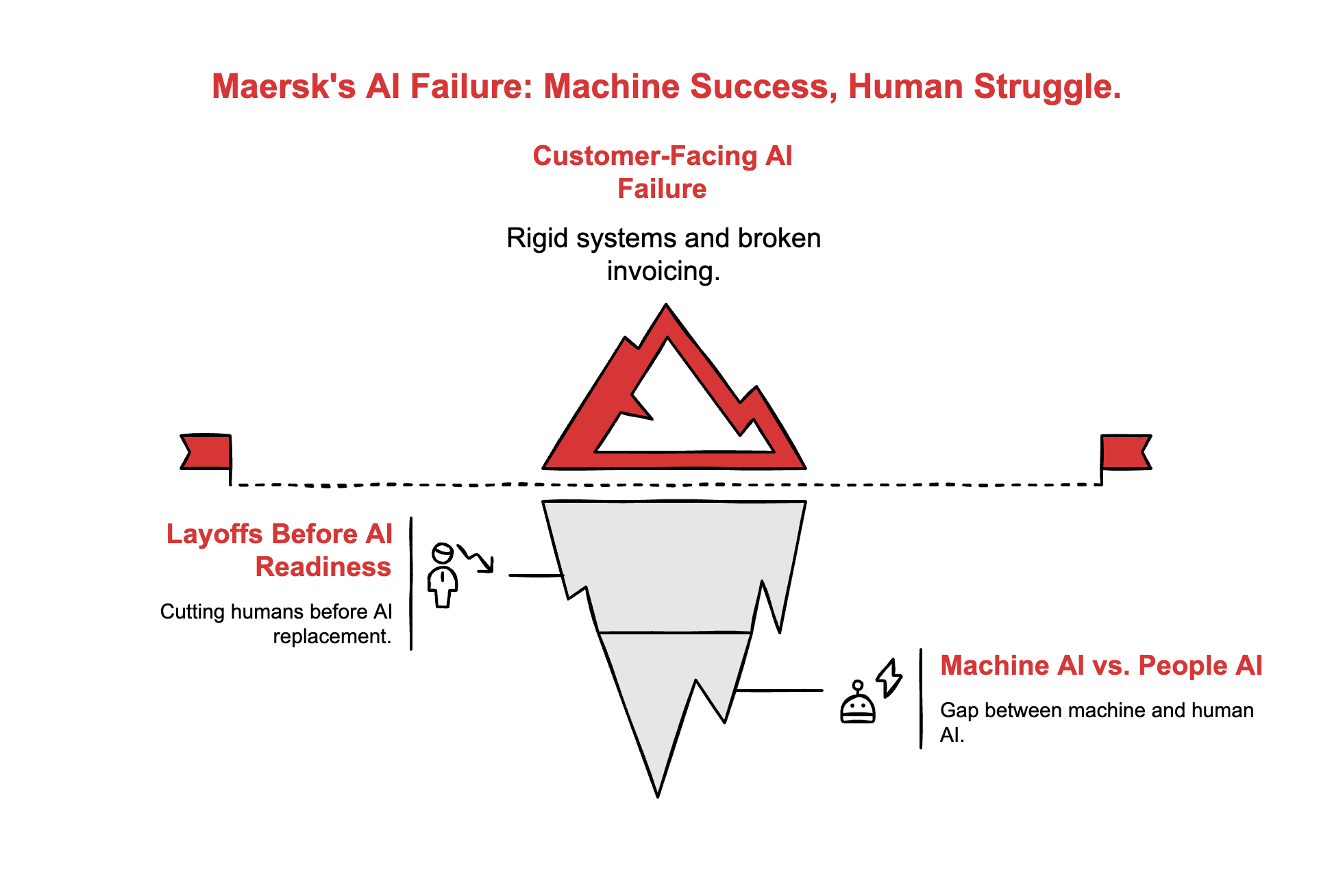 Then in February 2026, Maersk announced 1,000 corporate layoffs explicitly linked to AI-driven automation, targeting $180 million in annual savings. They cut the humans before the AI was ready to replace them.