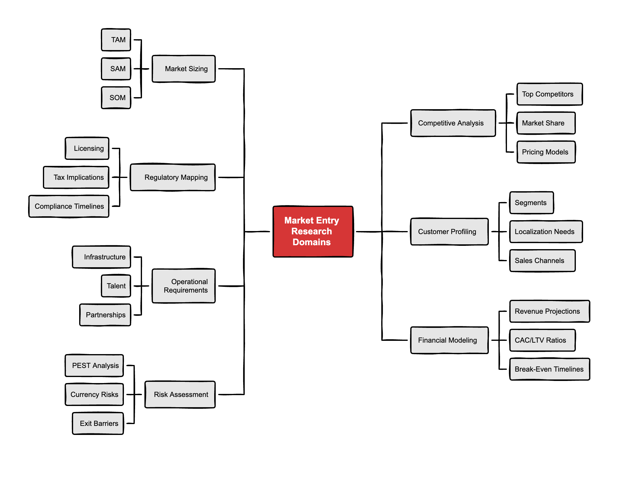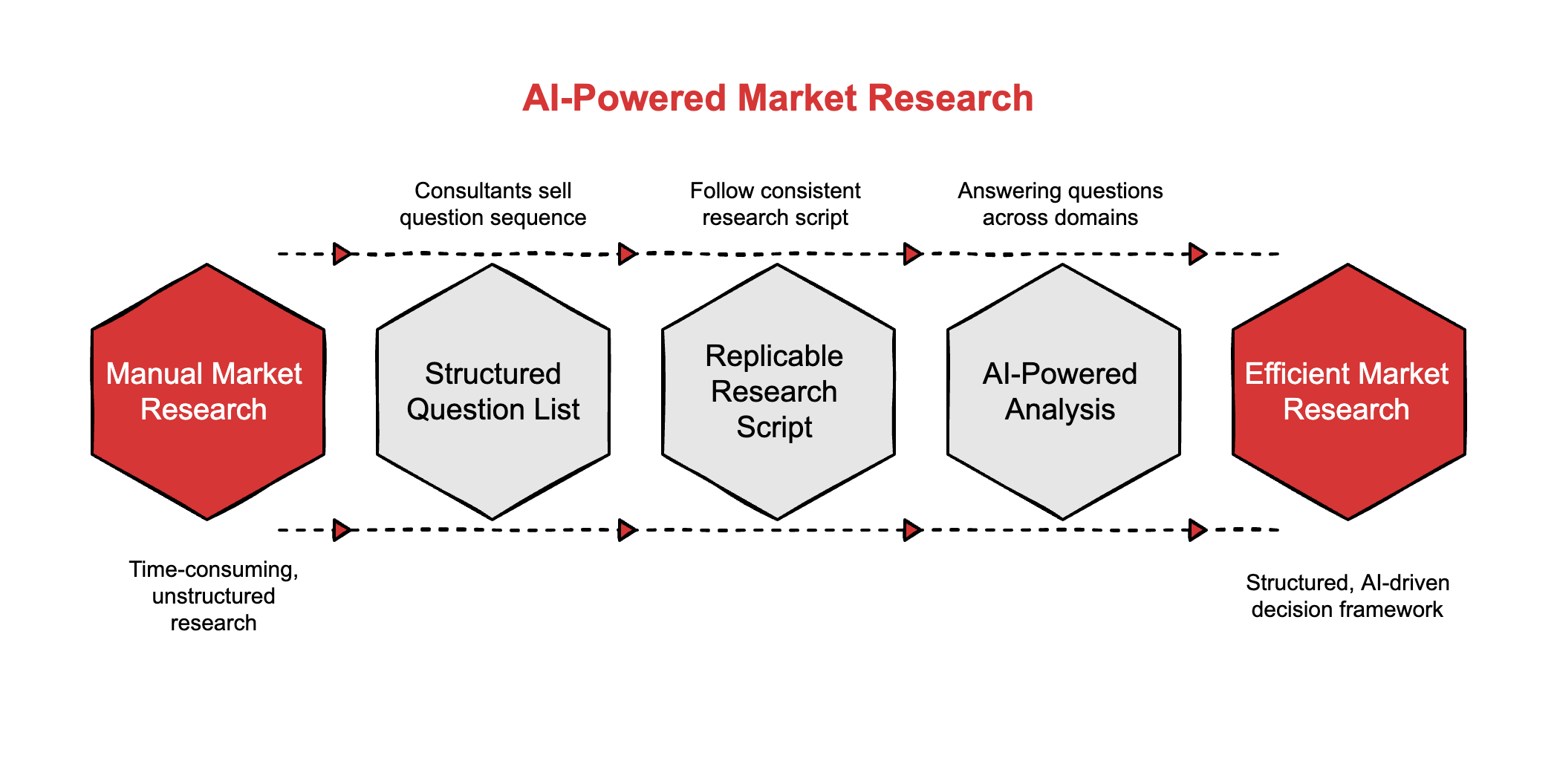 Consultants sell you the question sequence, not proprietary data. They follow a research script: market sizing, competitive landscape, regulatory environment, customer requirements, operational setup, financial viability, risk assessment. They score markets on consistent criteria. They build phased entry plans with milestones and budgets.