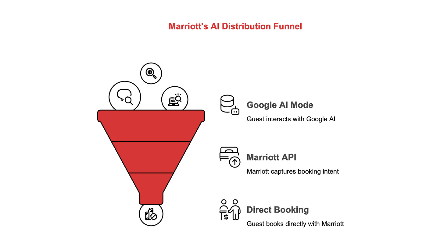 Marriott’s direct-booking integration with Google AI Mode is the most aggressive move in this entire strategy. When a customer asks a device to book a hotel, Marriott wants that transaction flowing through its own API, not through Expedia or Booking.com and their 15-20% commissions.