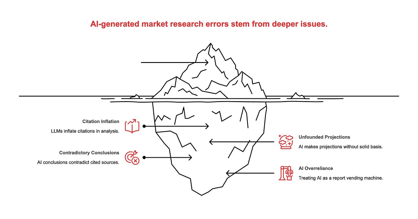 38% of AI-generated market research contains at least one material factual error. McKinsey tested sector analysis from LLMs and found citation inflation, unfounded projections, and conclusions that contradicted the cited sources.