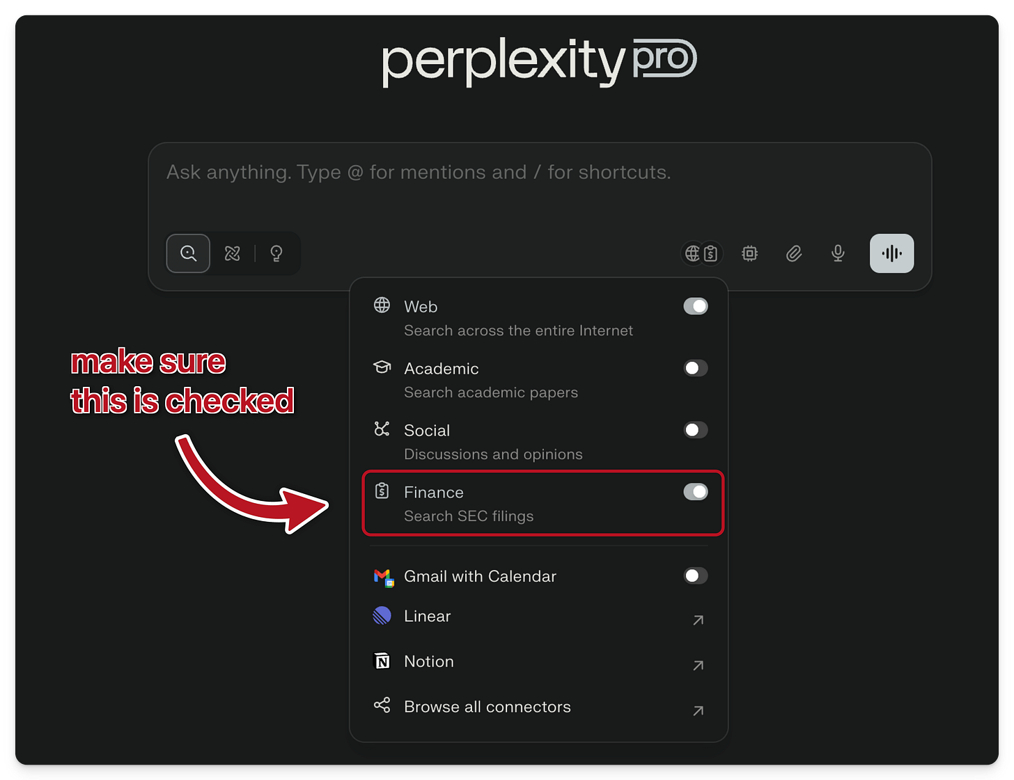 Paste the prompt into Perplexity. Turn on SEC filings access in the settings menu