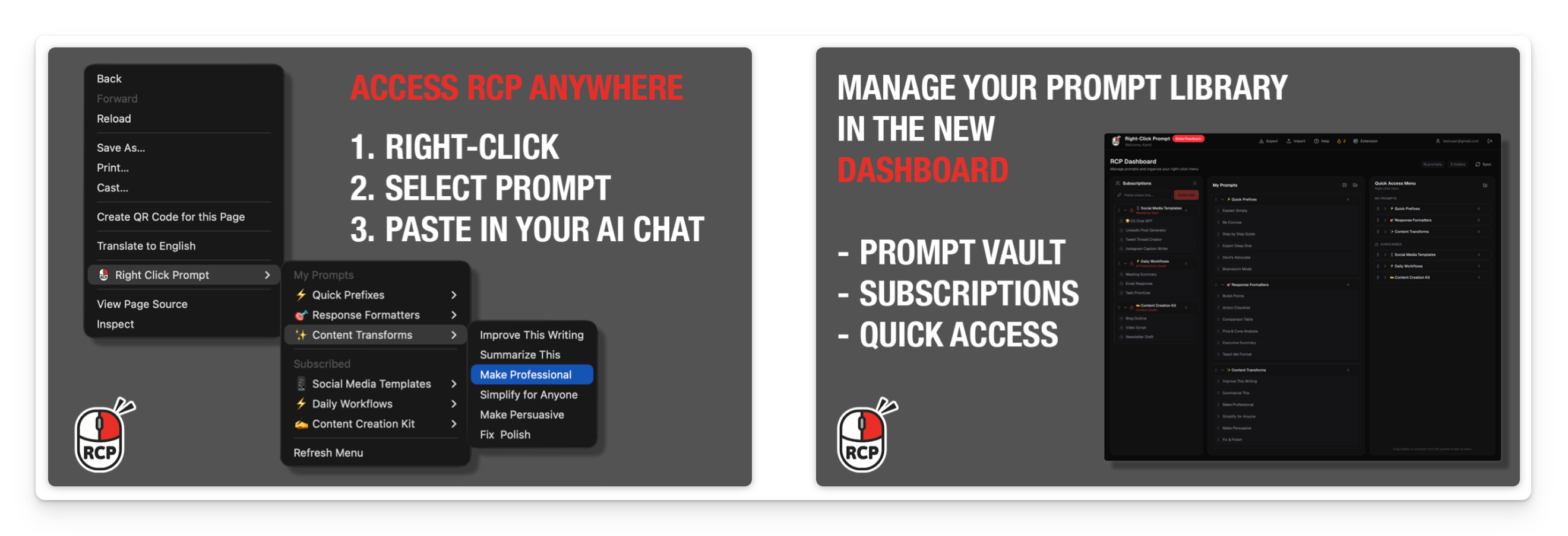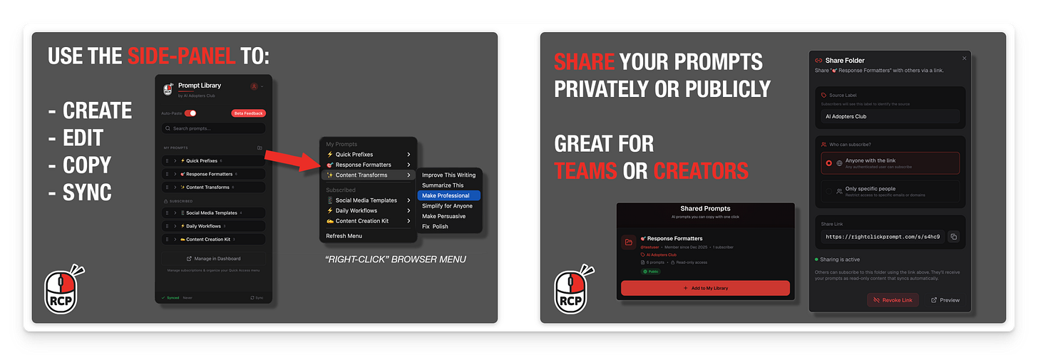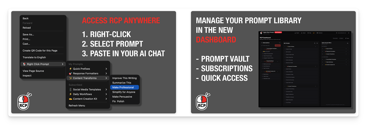Right Click Prompt streamlines your AI workflow by giving you instant access to your curated prompt library directly in any AI chat interface. With just a right-click: