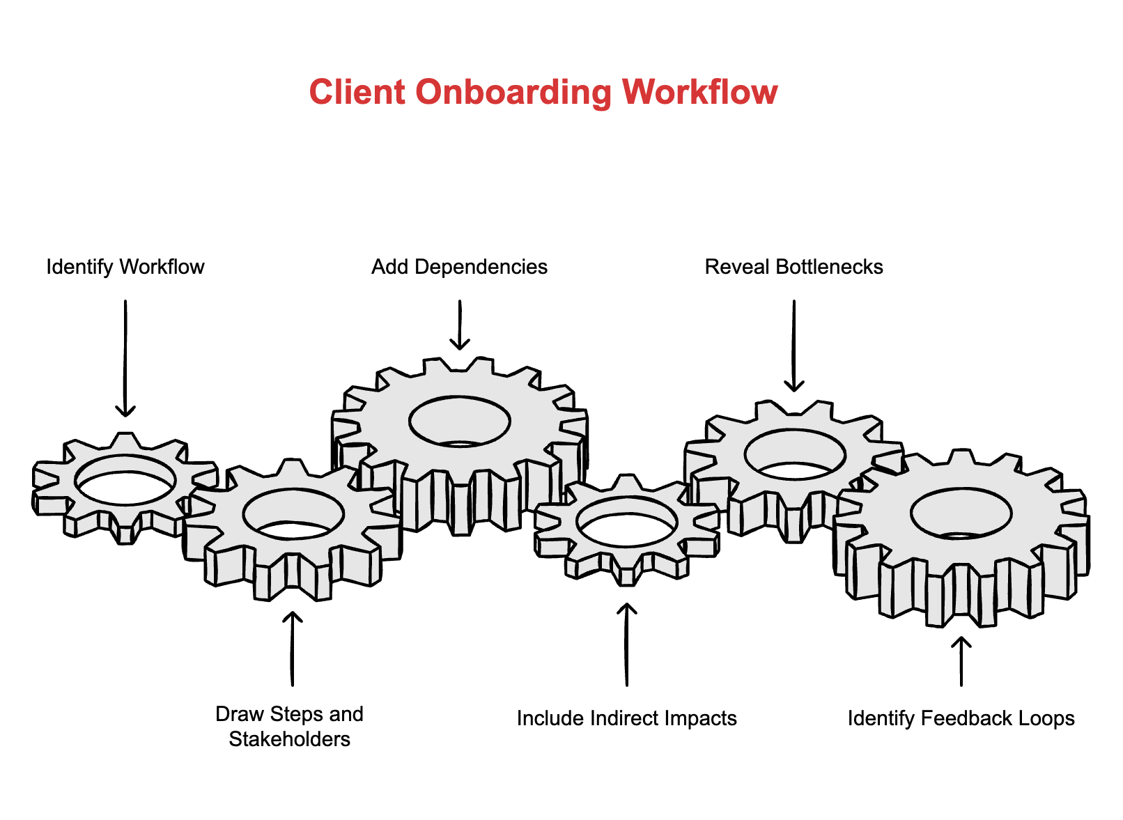 Onboarding a new client touches sales, legal, finance, delivery, and support. Each handoff creates delay risk. Even a messy map reveals bottlenecks and feedback loops you miss in sequence thinking.