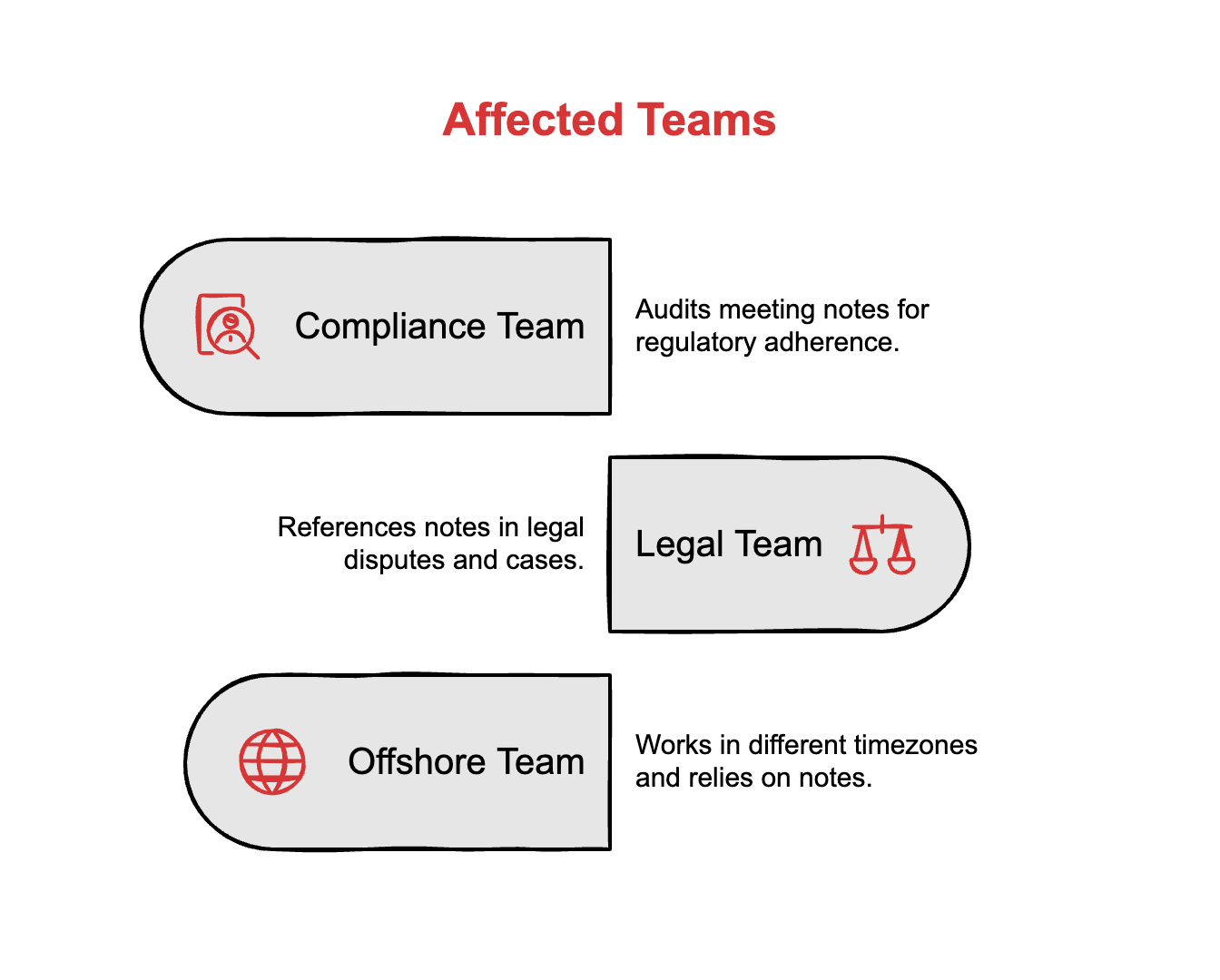 AI summarises meeting notes for your team. Who else gets affected? The compliance team that audits those notes. The legal team that references them in disputes. The offshore team working in a different timezone. One question surfaces dependencies you’d find later, when they break.