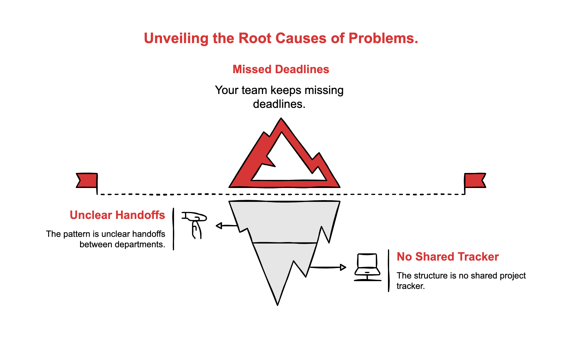 Your team keeps missing deadlines. That’s the symptom. The pattern is unclear handoffs between departments. The structure is no shared project tracker. Use this during retrospectives or standups to shift from firefighting to root cause.