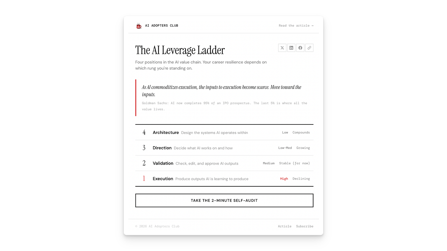 Love this ladder framing: way more actionable than the usual “learn to prompt” advice. I especially like the shift from job titles to “where you sit in the value chain”; it’s a clean mental model for deciding what to say yes/no to in your week.