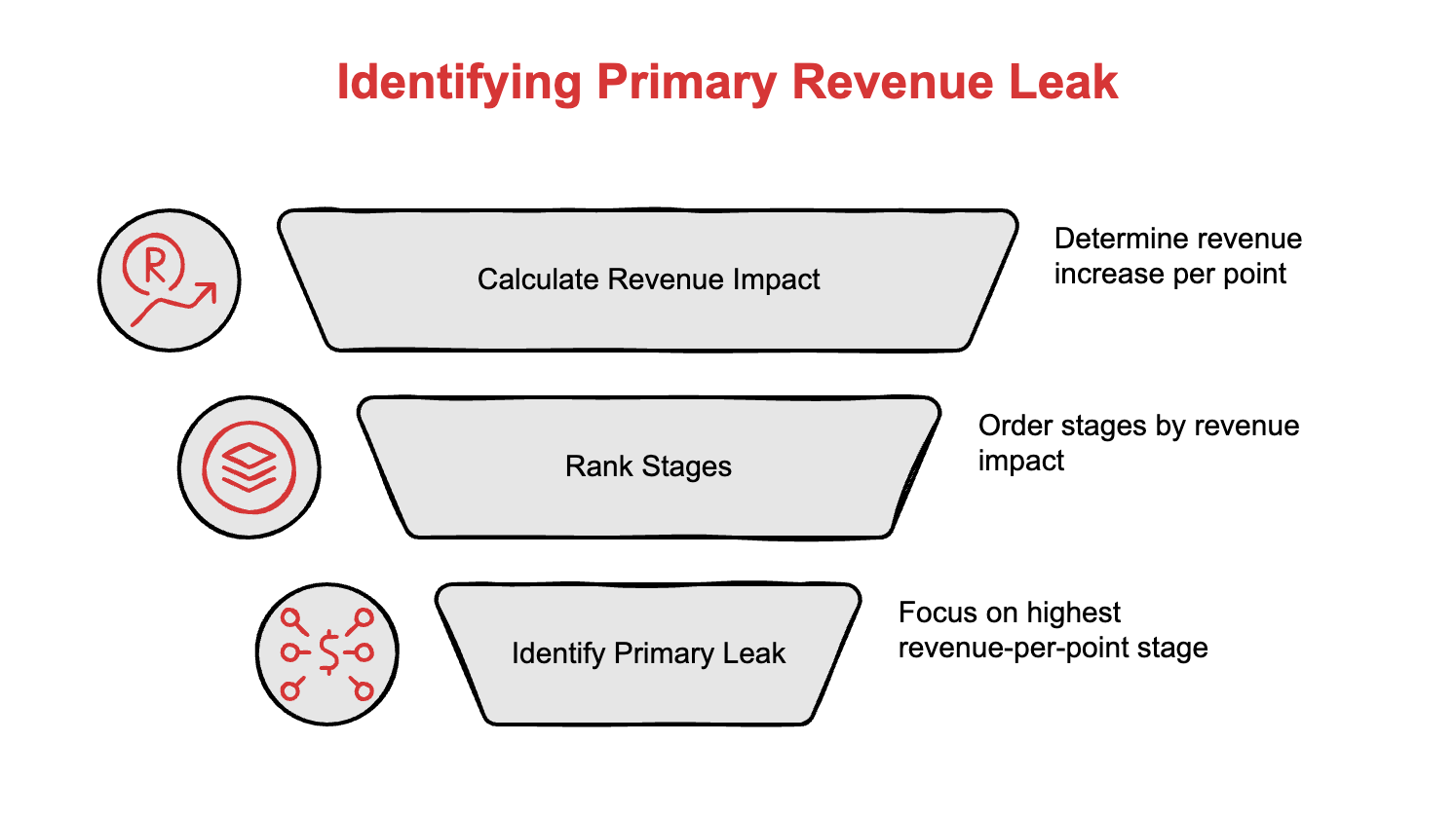 Run this for every stage. Rank them. The stage with the highest revenue-per-point is your primary leak. Everything else waits.