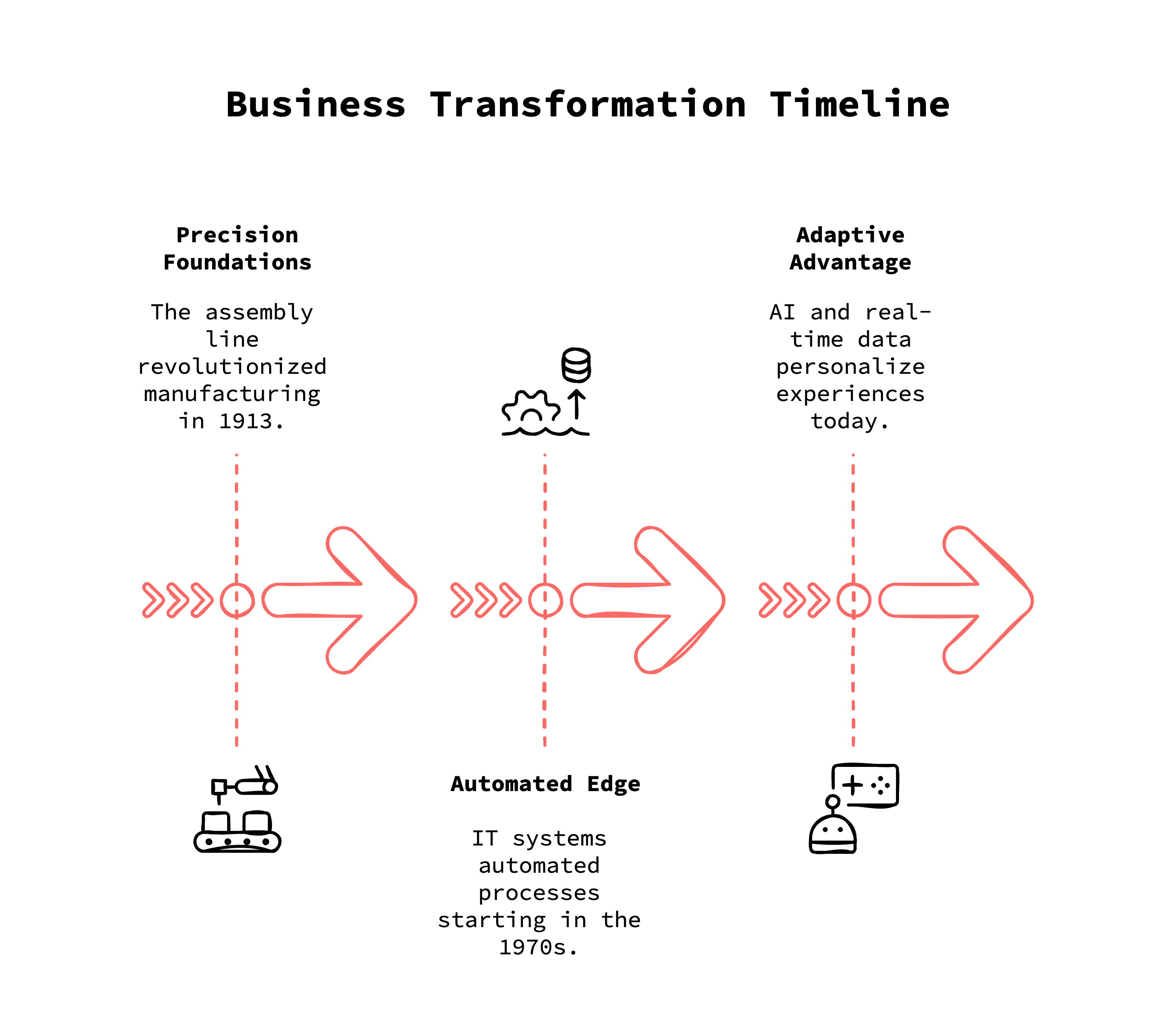 Business transformation has happened in three major leaps. Think of them like software updates, except they took decades instead of interrupting your workday with a "Your computer will restart in 10 minutes" message.