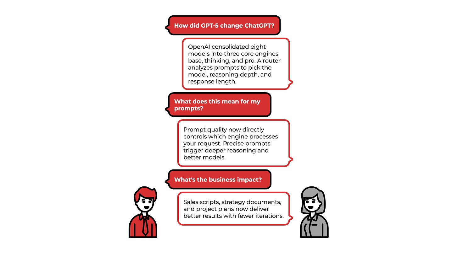 GPT-5 fundamentally changed how ChatGPT works. OpenAI took eight distinct models (O3, O4, O4 mini, O4 mini high, and others) and consolidated them into three core engines: base, thinking, and pro. Every prompt you send now gets analyzed by a router that picks which model to use, sets the reasoning depth (minimal to high), and determines response length.