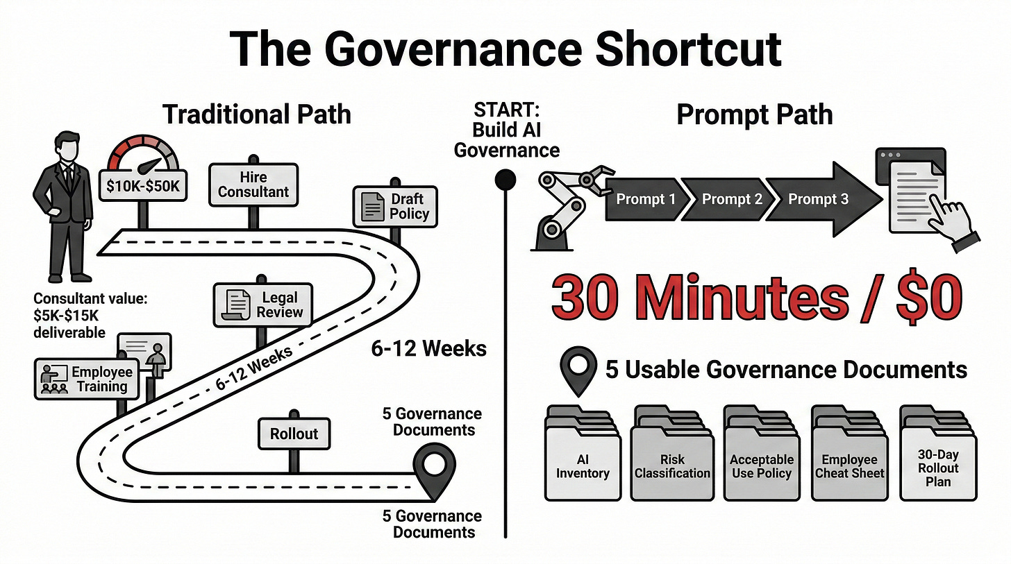 Without these prompts, governance setup takes 6-12 weeks and $10K-$50K in consulting fees. With them, you get a structured first draft in a single sitting.
