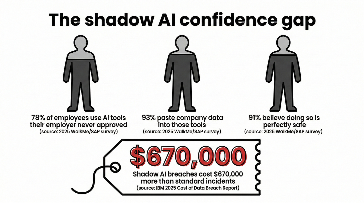 78% of employees use AI tools their employer never approved. 93% paste company data into those tools. 91% believe doing so is perfectly safe. (2025 WalkMe/SAP survey)